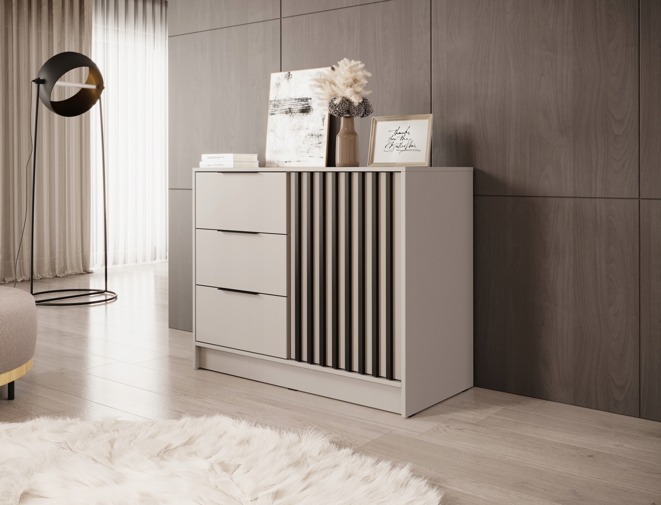 Этот комплект — идеальное решение для современной спальни или гардеробной. Трехдверный шкаф предоставляет достаточно места для одежды – внутри имеется штанга для вешалок, многочисленные полки и два ящика. Дополнительная пристройка позволяет использовать максимальную высоту помещения, увеличивая возможности хранения. Небольшой комод шириной 105 см дополняет комплект, предлагая место для одежды, документов или мелких предметов. Характерные рейки и матовые фасады придают мебели неповторимый характер.