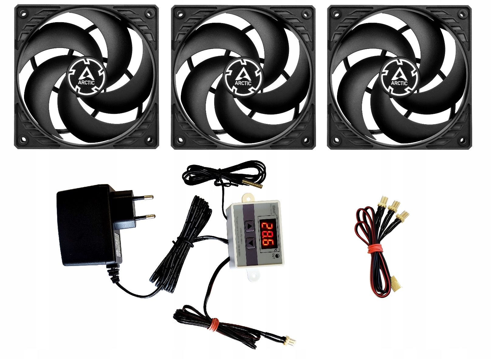 Готовый комплект для охлаждения стоечных шкафов. Версия с более мощными 120-мм вентиляторами Arctic P12 Black. Просто подключите штекеры и установите температуру для включения и выключения вентилятора. Например, установив температуру включения под кнопкой ▲ на 28°C и температуру выключения под кнопкой ▼ на 30°C, вентилятор включится при 30°C и выключится после охлаждения до 28°C. °С. На дисплее будет постоянно отображаться текущая температура, как при включенном, так и при выключенном вентиляторе. Термостат запоминает настройки после отключения от сети. Этот комплект также можно подключить к регулятору скорости вентилятора, который имеется в нашем предложении. В комплект входят блок питания, цифровой термостат, распределитель и 3 вентилятора Arctic P12 120х120 мм.