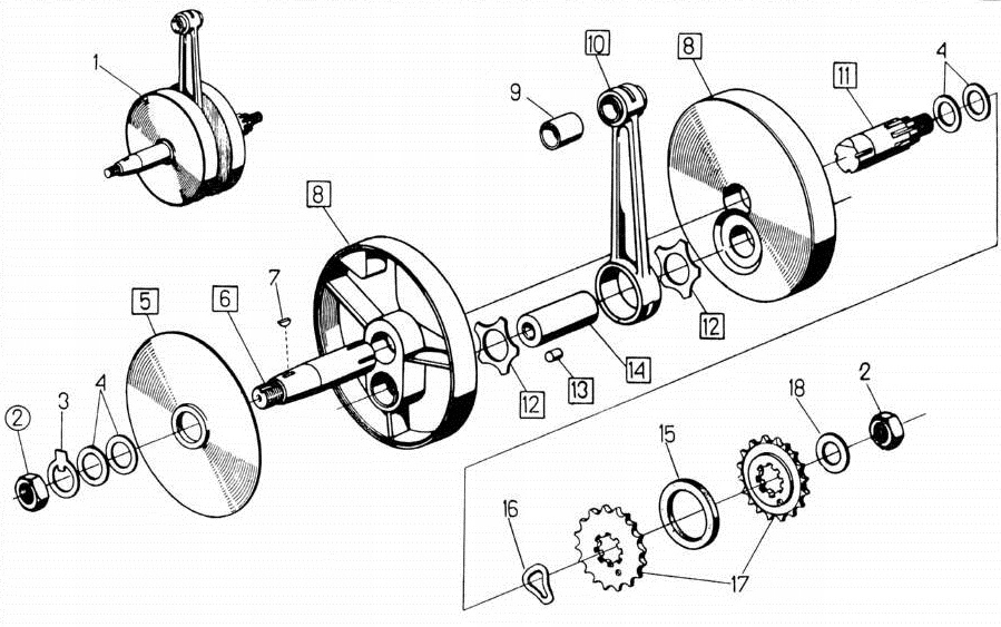 Расстояние между коленчатыми валами может быть выполнено по внутреннему диаметру (заводское решение см. №4 на чертеже) и дополнительно снаружи (макс. 1 шт. наружной шайбы на каждый гнездо).