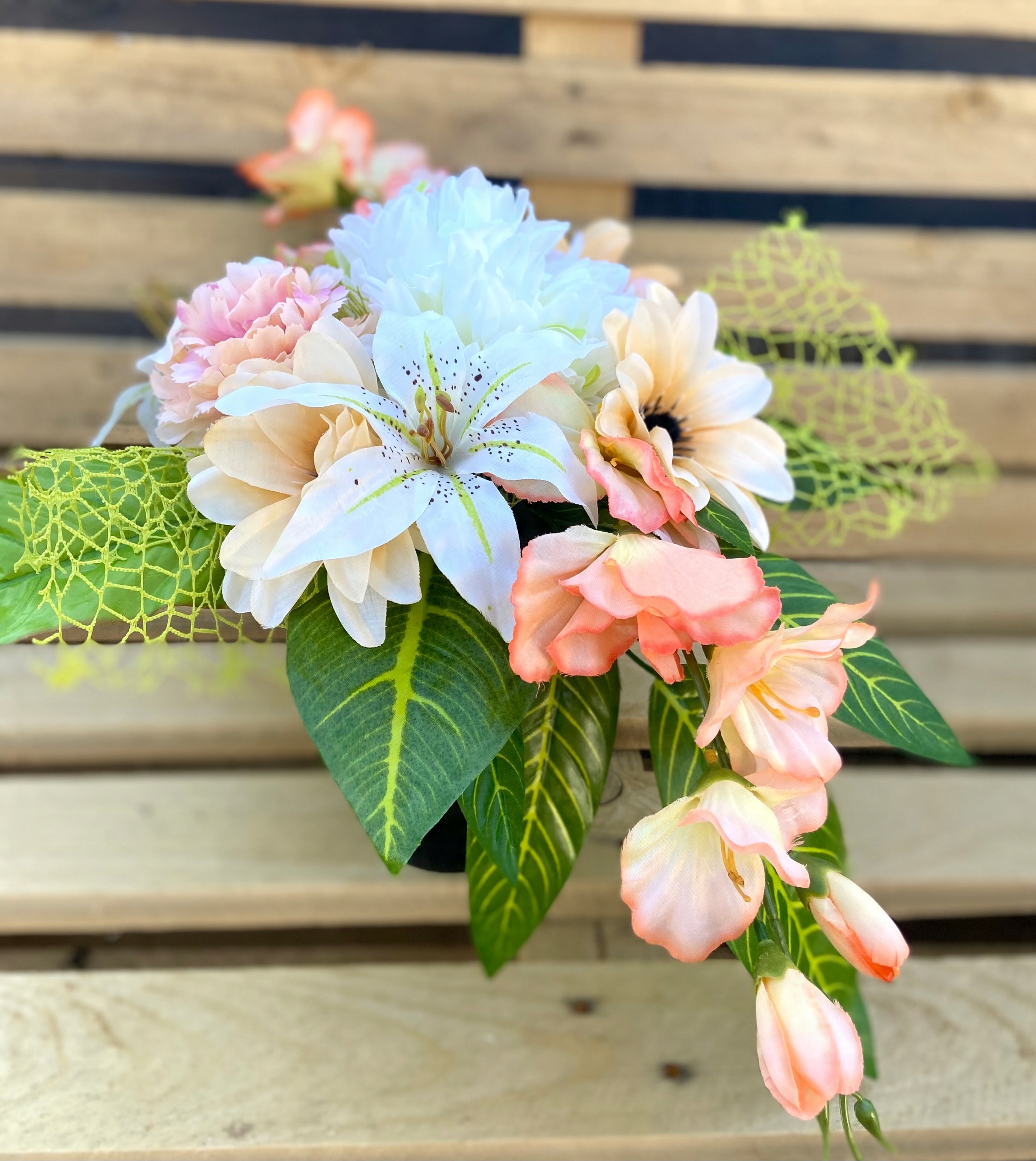 Букет красивый. подготовленный в устойчивой чаше, наполненной бетоном и готовый к установке на надгробие. Букет оформлен в трубке для установки в последнюю вазу на надгробии. Туба не загружена.