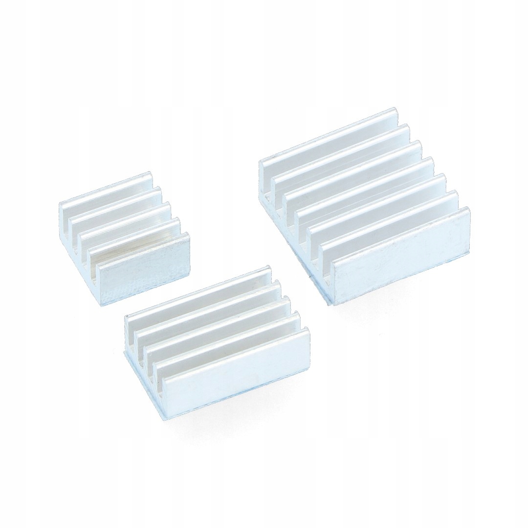 Набор из 3-х серебряных радиаторов размером 9 х 9 мм, 14 х 9 мм, 14 х 14 мм. Сзади имеется двусторонняя термопроводящая лента. Они совместимы с миникомпьютером Raspberry Pi 4. Радиаторы — это элементы крепления, используемые для охлаждения систем. Его внешняя поверхность развита чаще всего в виде ребер и брусков.