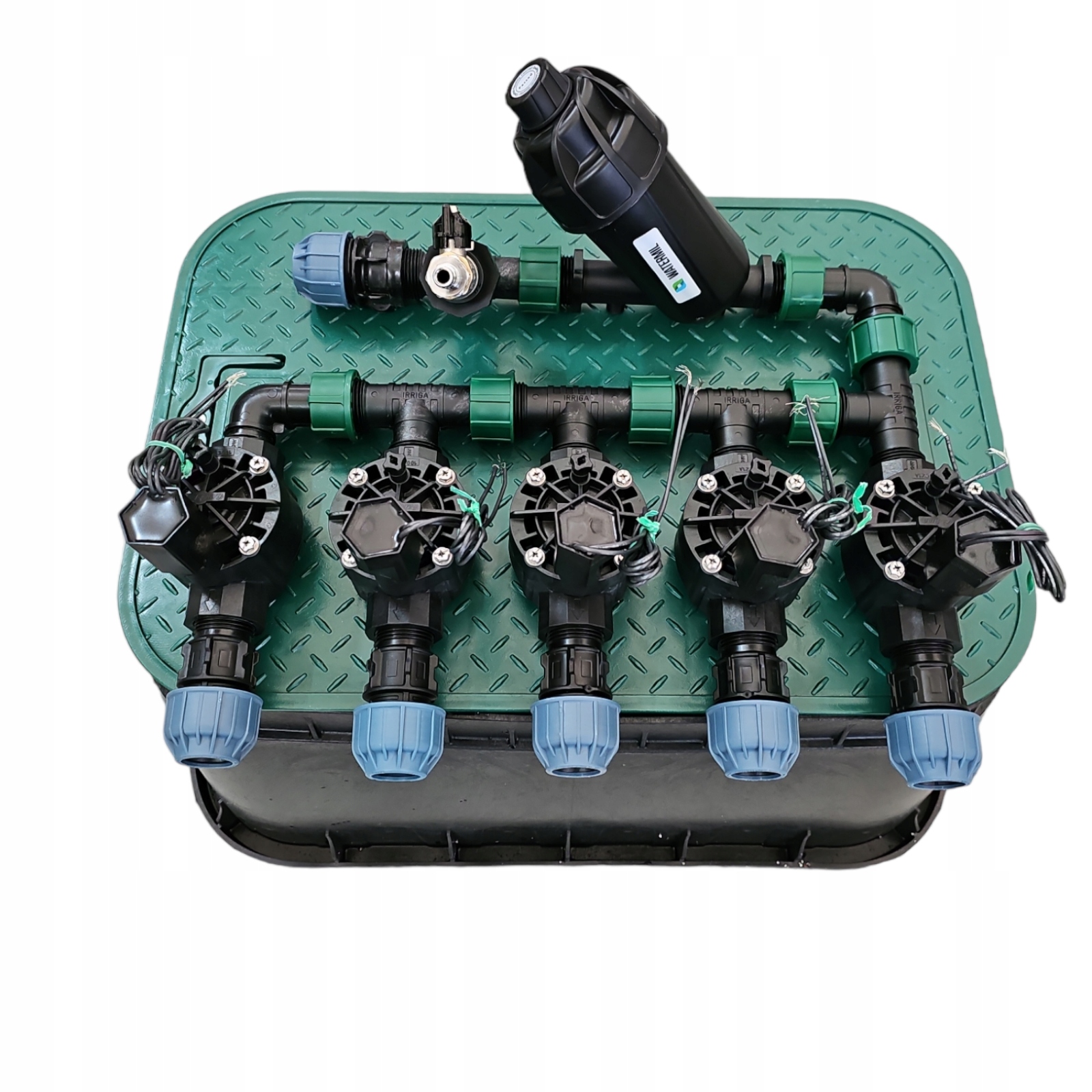 Комплект для орошения из 5 секций с электромагнитными клапанами Rain Bird, дисковым фильтром Watermil 1 дюйм, разъемом для подключения компрессора и колодцем электромагнитного клапана Rainworks Jumbo.