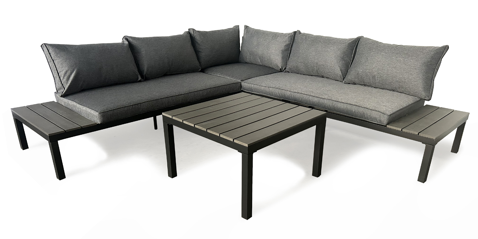 Он идеально смотрится на террасе и на лужайке. Стол со столешницей из полидерева. В комплект входят 3 подушки для сиденья и 6 подушек для спины.