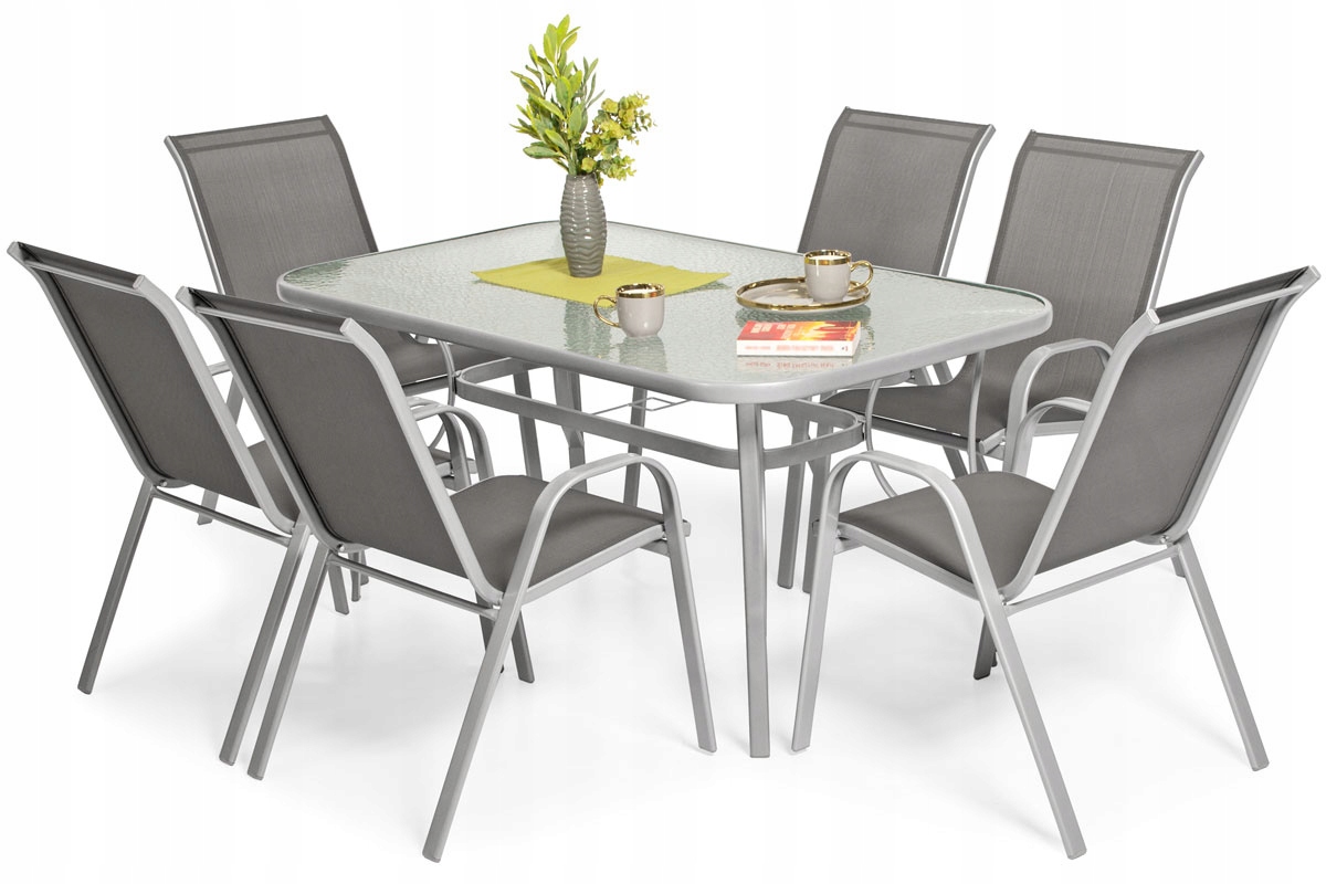 Комплект садовой мебели на 6 человек, стеклянный стол, 6 серых стульев