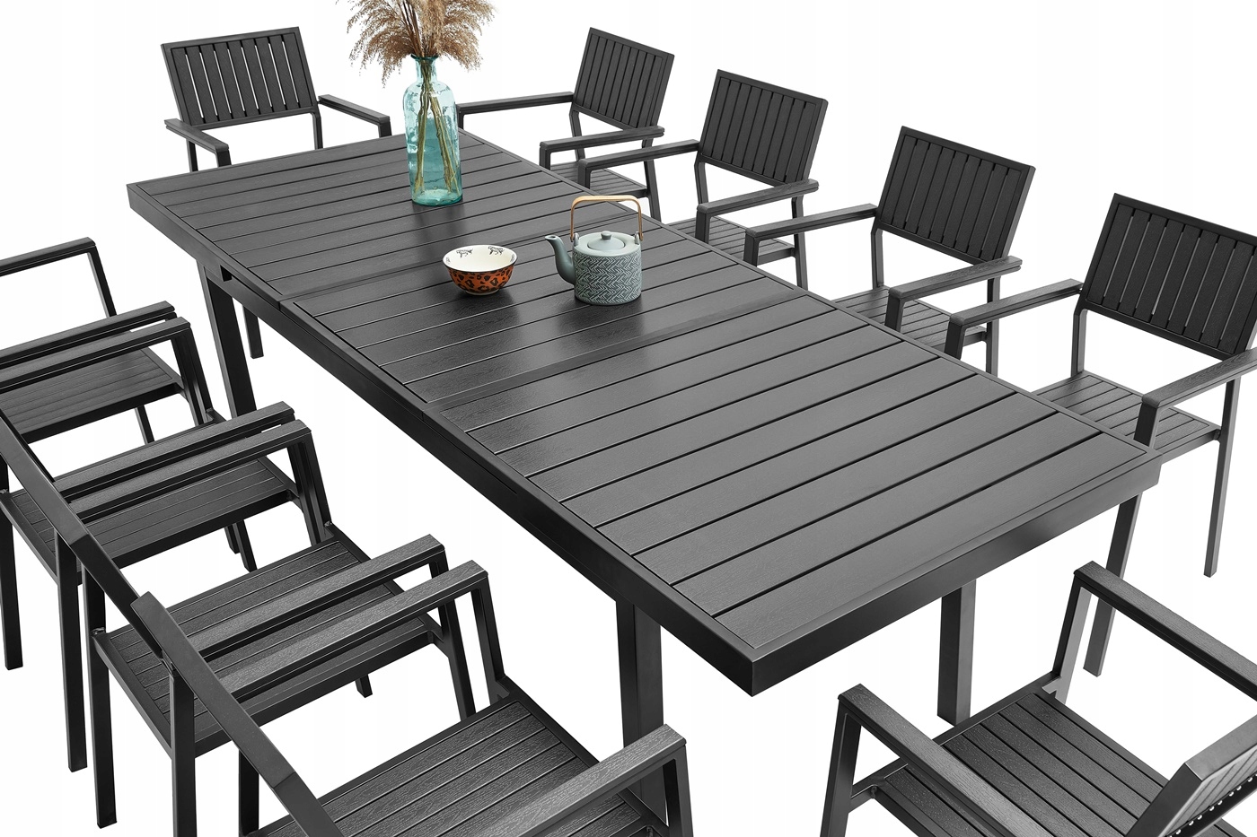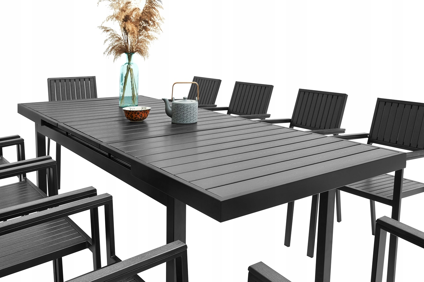Конструкция стола и стульев изготовлена из высококачественного алюминия с порошковым покрытием. В предлагаемом комплекте столешница изготовлена из водопоглощающих композитных плит ДПК, используемых, в том числе, для производства современных террасных и фасадных систем. Важнейшим конструктивным элементом стола являются направляющие, которые позволяют удлинить стол до 240см. Их использование делает стол еще более просторным после сборки всего стола, а значит, за ним может сесть еще больше гостей! Такое решение позволило получить свободное место под столом и избежать лишних дополнительных конструкций, которые мешали бы комфортному использованию мебели.
