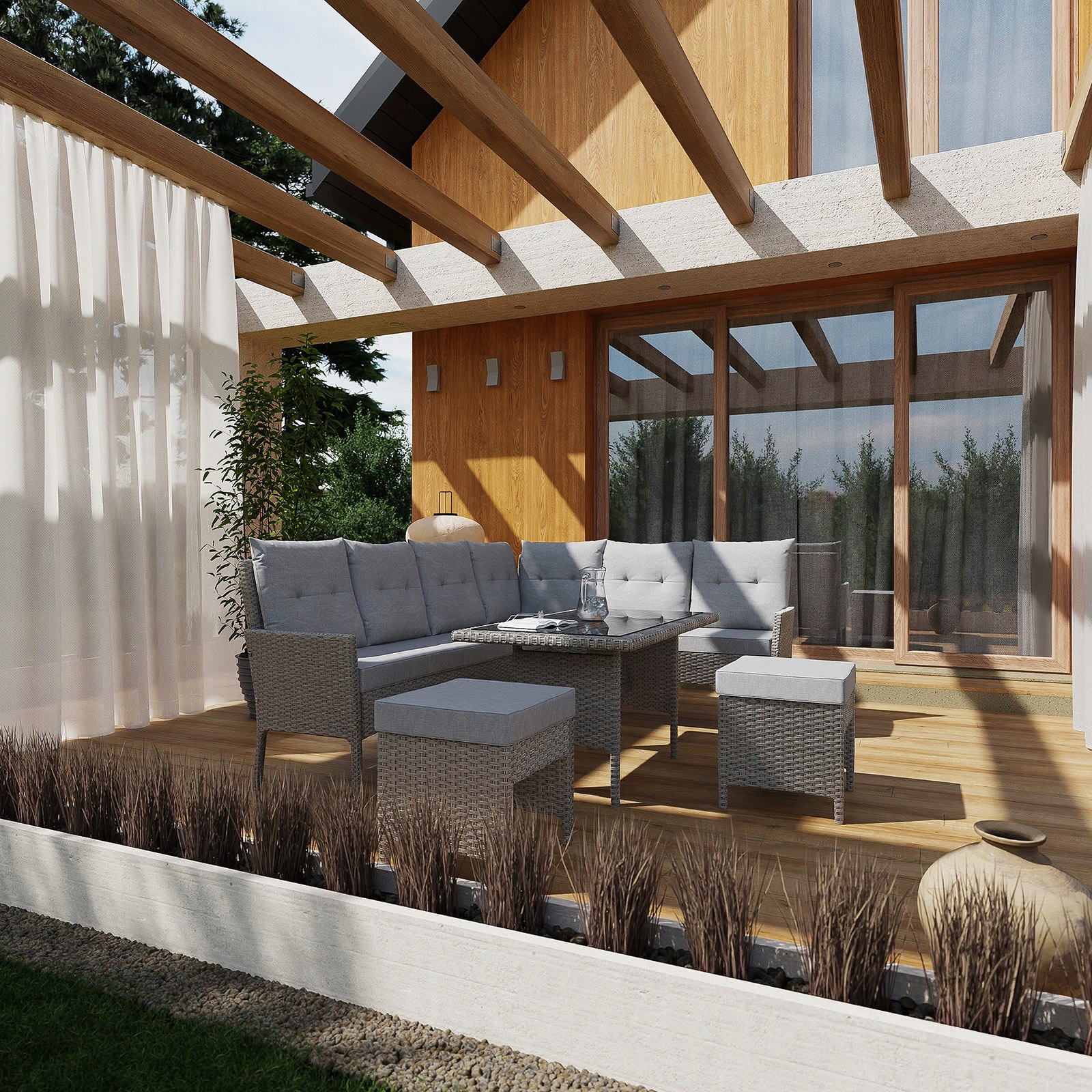 - Цвета: антрацитовый ротанг + серые подушки + черное стекло