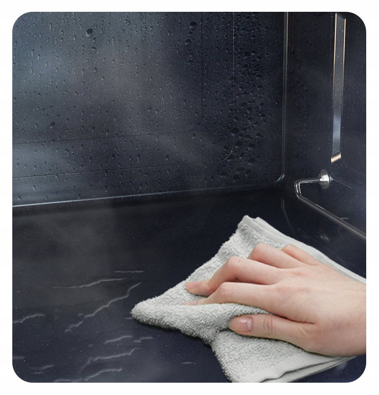 Чистка паром – быстрый и удобный метод, не требующий использования моющих средств. Чтобы эффективно очистить микроволновую печь, достаточно налить внутрь немного воды и выбрать функцию очистки паром, которая эффективно растворит грязь. Наконец, грязь можно легко удалить тряпкой.