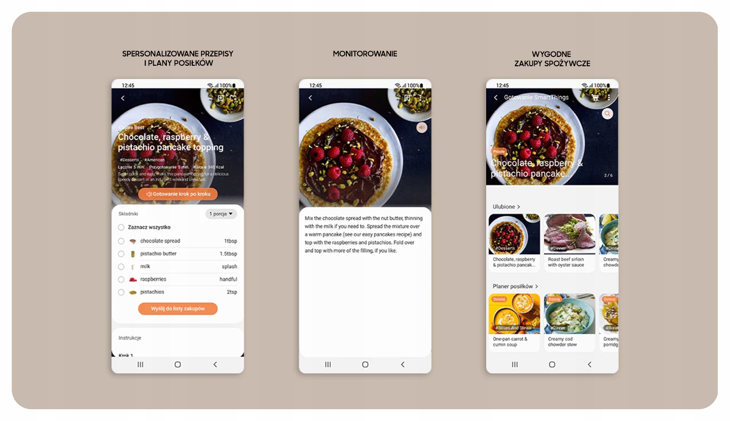 Теперь готовить станет приятнее! Решение SmartThings Cooking экономит время и значительно облегчает процесс приготовления пищи благодаря комплексному обслуживанию. Он понимает потребности и диетические предпочтения пользователя и адаптирует к ним персональные рецепты, а также готовит план питания на всю неделю. С другой стороны, приготовление под руководством позволяет контролировать процесс приготовления одним касанием.