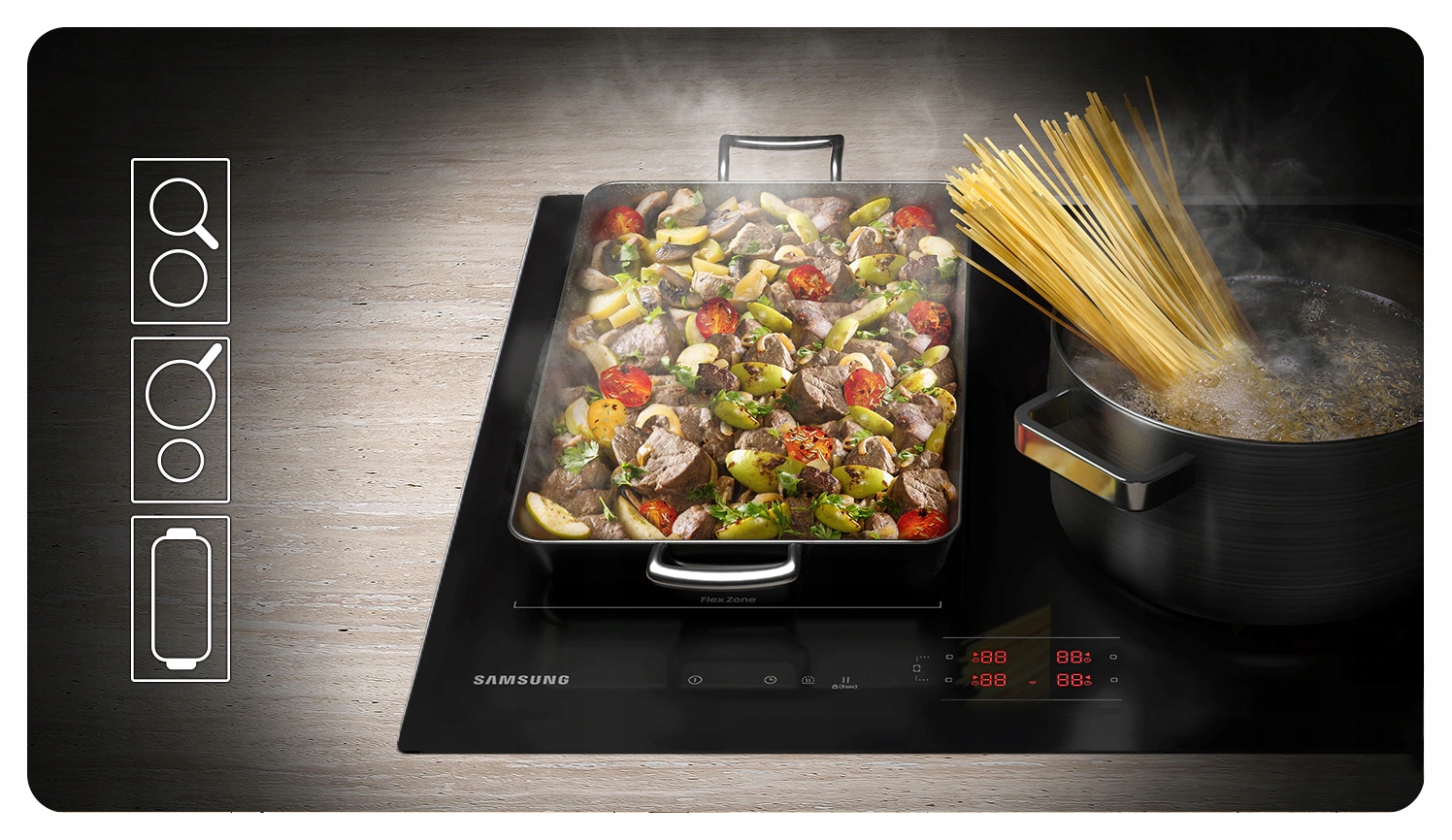Наслаждайтесь полной гибкостью при приготовлении самых разных блюд с помощью Flex Door. Просто откройте половину духовки, чтобы использовать верхнюю зону для приготовления небольших блюд, или откройте всю дверцу, чтобы использовать обе зоны. Благодаря этому вам будет намного проще следить за ходом приготовления и приправлять блюда, не теряя при этом тепла.