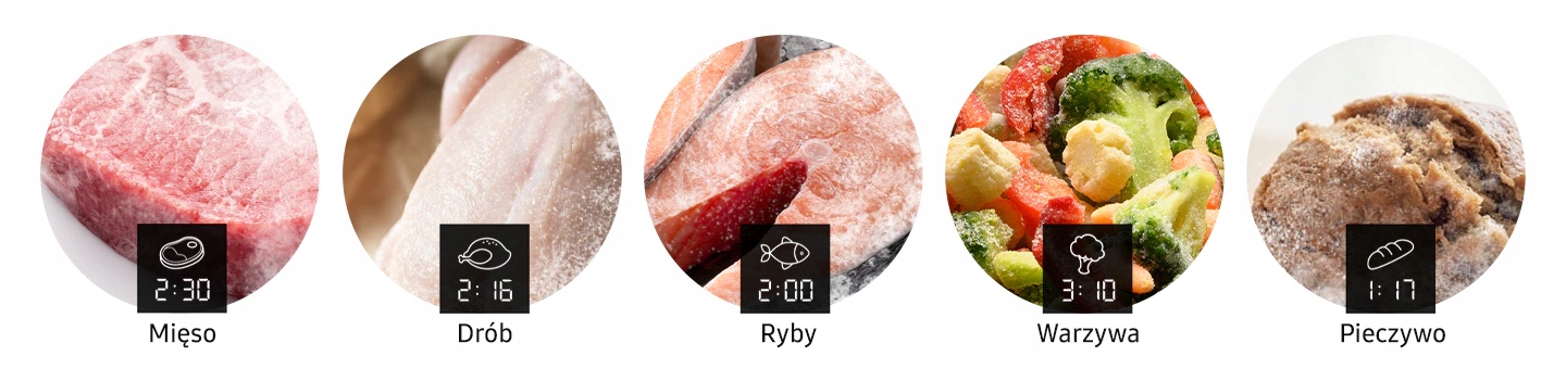 Быстрое размораживание продуктов с помощью функции Quick Defrost с 5 вариантами для наиболее часто замораживаемых продуктов: красного мяса, птицы, рыбы, овощей и хлеба. Просто выберите тип и вес продукта, и прибор рассчитает оптимальное время разморозки. Теперь приготовление необходимых продуктов занимает меньше времени – и они не теряют своей пищевой ценности!