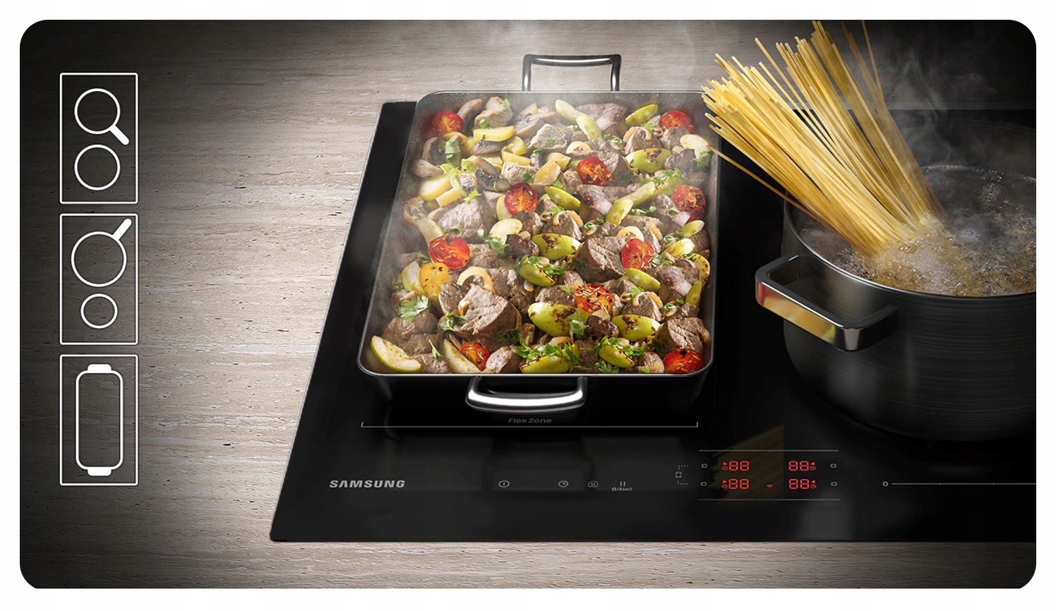 Индукционная варочная панель Samsung нагревается только под поставленной на нее посудой, что сводит к минимуму риск ожогов. Активация блокировки путем нажатия соответствующего значка в течение 3 секунд гарантирует, что варочная панель будет заблокирована. Это дает пользователю уверенность в том, что дети не активируют его случайно. Кроме того, если настройка зоны нагрева не будет изменена в течение длительного времени, она отключится. Также в случае сбоя, например. при перегреве устройство автоматически выключится.
