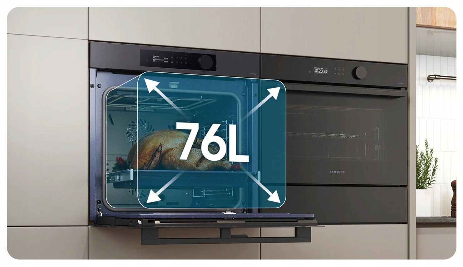 Объем до 76 л позволяет легко готовить большие порции еды. Это открывает новые возможности при приготовлении пищи. Готовя вечеринку, вы легко сможете приготовить разные блюда одновременно. В духовке легко поместятся даже большие блюда, например, большая индейка, запланированная на семейную встречу.