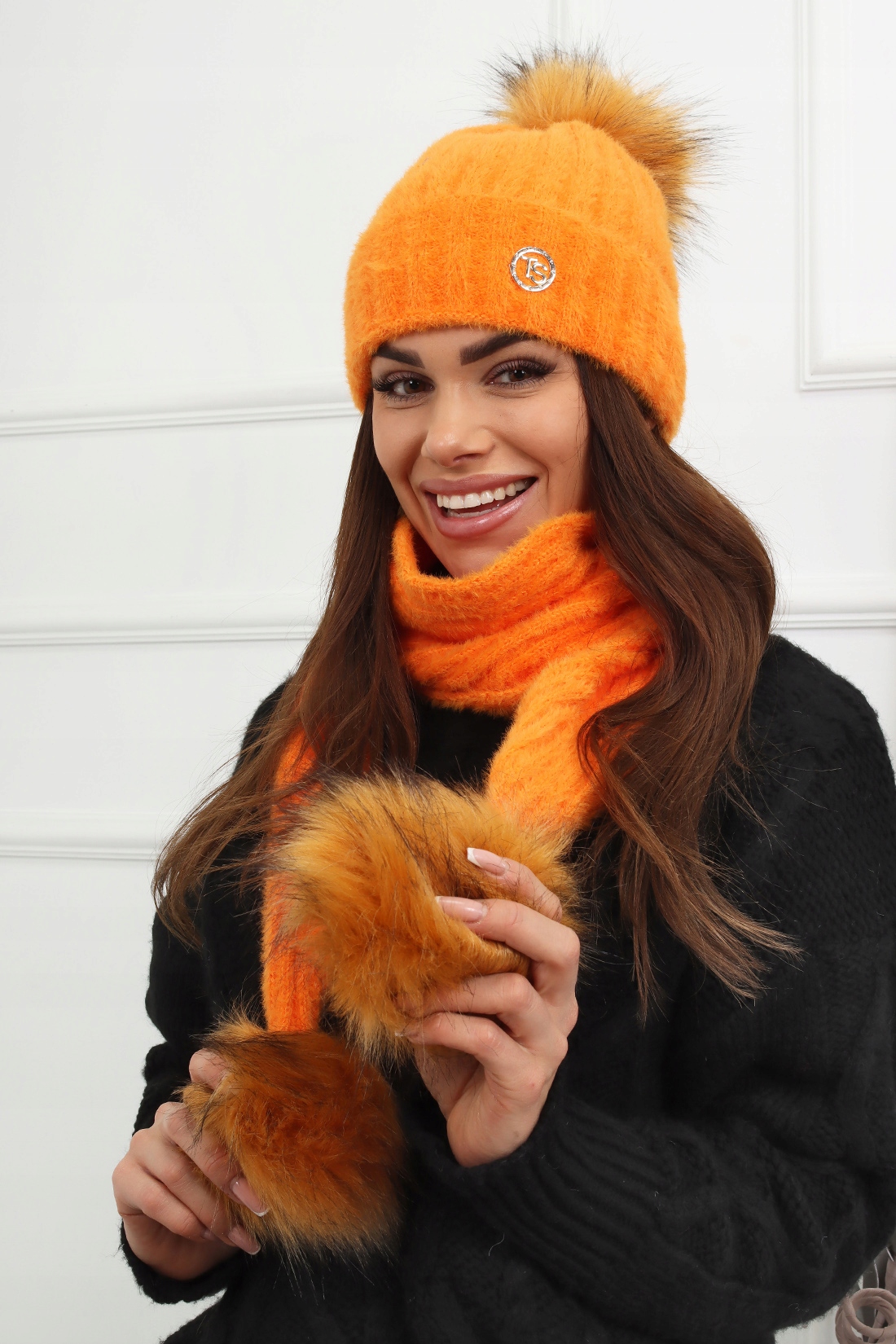 ЗИМНИЙ КОМПЛЕКТ ШАПКА АЛЬПАКА + ОРАНЖЕВЫЙ ШАРФ 2513