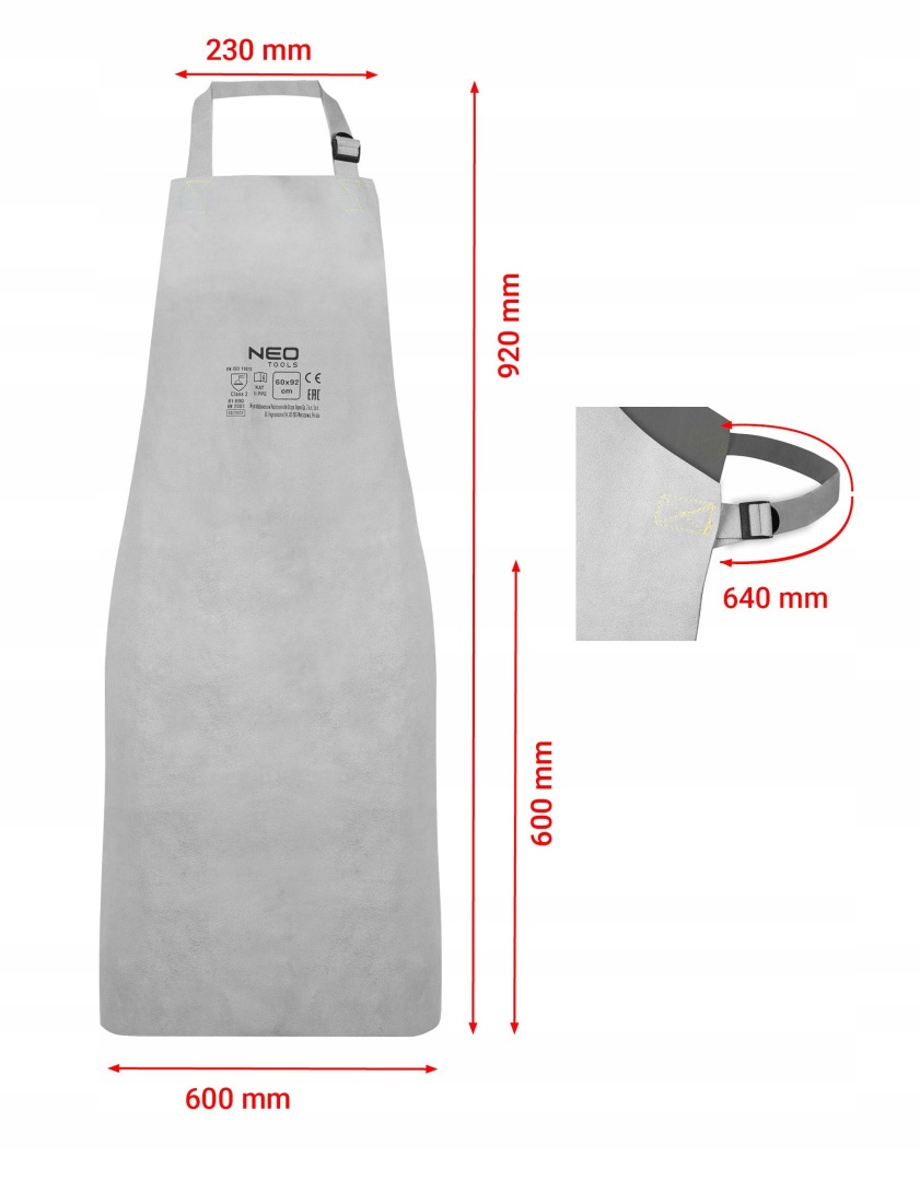 Кожаный сварочный фартук 60 х 90 см 81-890 производства NEO — это фартук из спилка воловьей кожи толщиной 1,2-1,4 мм. Оснащен кожаным шейным ремнем с регулировкой пряжки и кожаным поясничным ремнем, также регулируемым пряжкой. Оба ремня имеют максимальную длину 65 см и крепятся кевларовой нитью. Фартук размерами 60 х 90 см относится ко второй защитной категории. Сертифицировано его соответствие стандарту EN ISO 11611:2015 и сертификату CE. Это чрезвычайно прочная и прочная спецодежда NEO, предназначенная для сварочных работ.