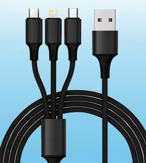 Версия кабеля для зарядки телефона 3в1, имеет 3 входа для телефонов Lightning, Micro-USB и Micro-USB USB Type-C. Очень универсальный кабель, хорошо работает в любой сложной ситуации. Кружевная оплетка и металлические наконечники обеспечивают долговечность использования.