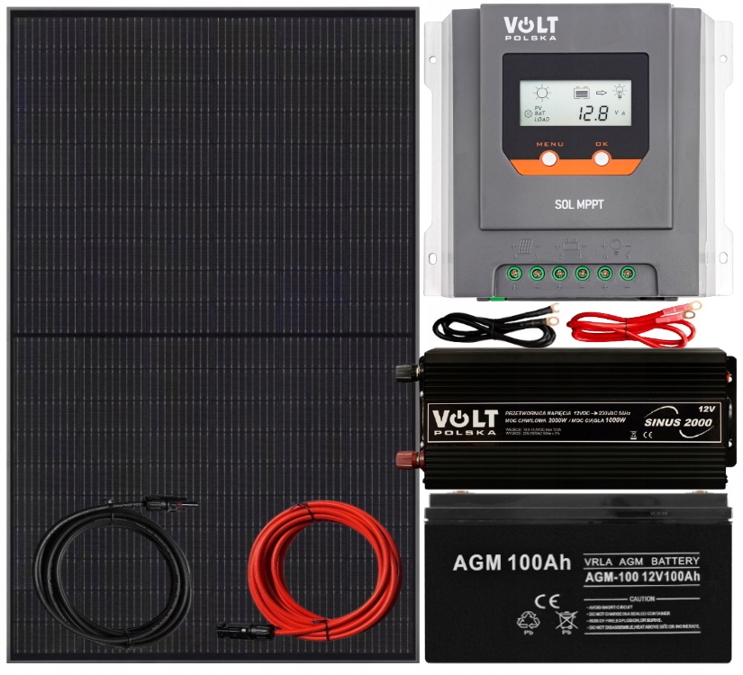 Готовый фотоэлектрический комплект на базе СИНУС-2000 12В 230В 2000Вт солнечный преобразователь / ЧЕРНАЯ МОНО СОЛНЕЧНАЯ ПАНЕЛЬ / Аккумулятор 100 Ач, кабели и соединительные клеммы — единственное в своем роде