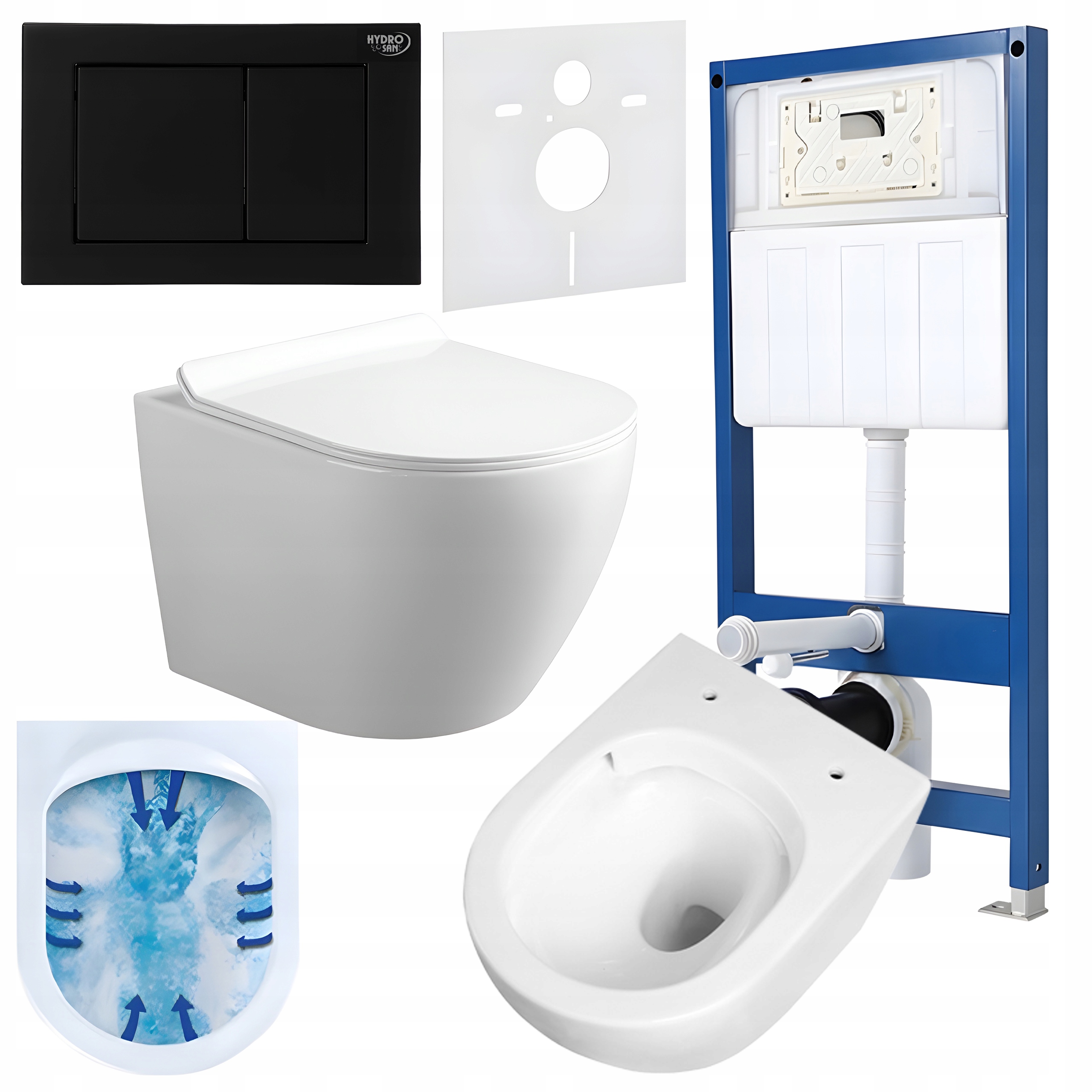 Унитаз скрытого монтажа Hydrosan с подвесным унитазом MIZU-WH-RIM-01 и The Кнопка смыва BUTTON-7-BL — идеальное решение для людей, которые ищут элегантную и функциональную систему для ванной комнаты. Эта система отличается современным дизайном, который идеально вписывается в минималистичный интерьер, обеспечивая при этом максимальную экономию пространства. Каркас скрытого монтажа позволяет спрятать элементы установки в стене, делая ванную комнату более просторной и эстетичной. Унитаз MIZU-WH-RIM-01, изготовленный из высококачественной санитарной керамики, гарантирует не только элегантный внешний вид, но также простоту очистки и гигиены, что делает его отличным выбором для современных интерьеров.