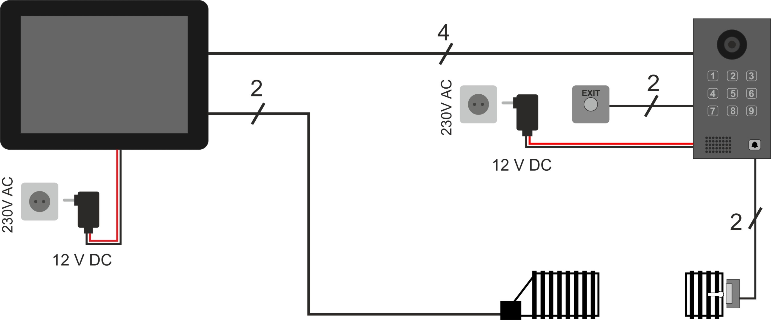 - Подключение 4 провода +2 провода питание на замок и внешнее станция +2 провода для управления автоматическими воротами.