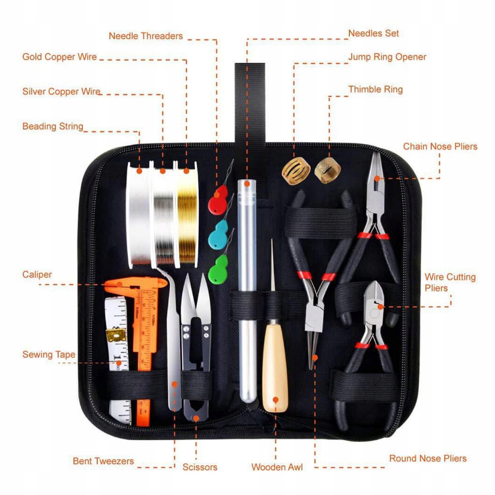 В комплект пакет - набор материалов для изготовления ювелирных изделий содержит 3 ювелирных плоскогубца, 2 медных проволочных роликов, 1 прозрачная струна для бусин, 6 штук, 1 пинцет, 1 зажим, 1 Szydło, 1 открывалка для прыжков, 1 пуховики, 1 ножницы, меры, 3 нити, 1 и коробка с 13 различными типами Ювелирные ювелирные изделия полуавтомированные продукты