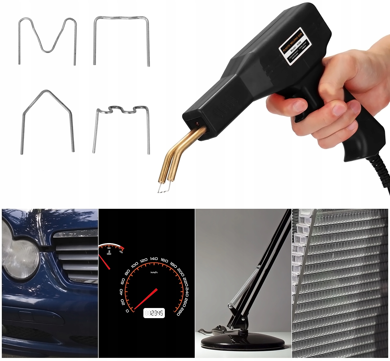 В комплект входит 200 скоб, с помощью которых устройство надолго соединит треснувшие пластиковые элементы a место подключения будет устойчиво к ударам и скручиванию.