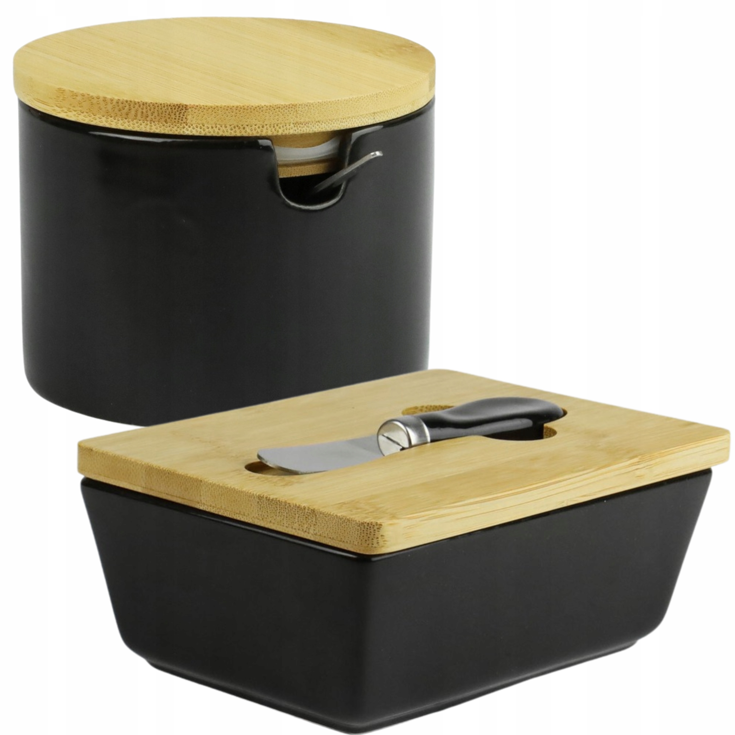 KOMPLET CUKIERNICA +MASELNICA PORCELANOWA ZESTAW CZARNY Z BAMBUSOWĄ POKRYWĄ