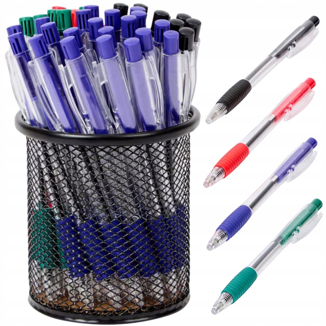 - 40 пластиковых ручек в одном наборе разных цветов, активируются щелчком, закрываются нажатием на клипсу.