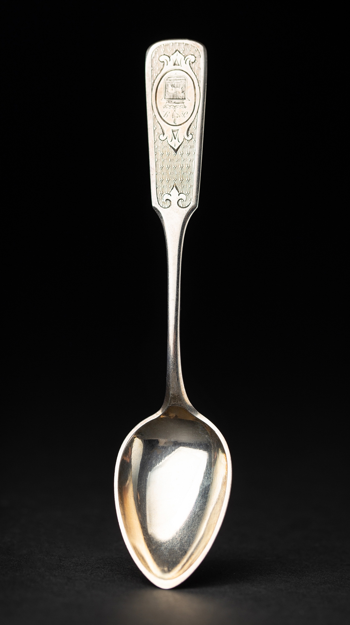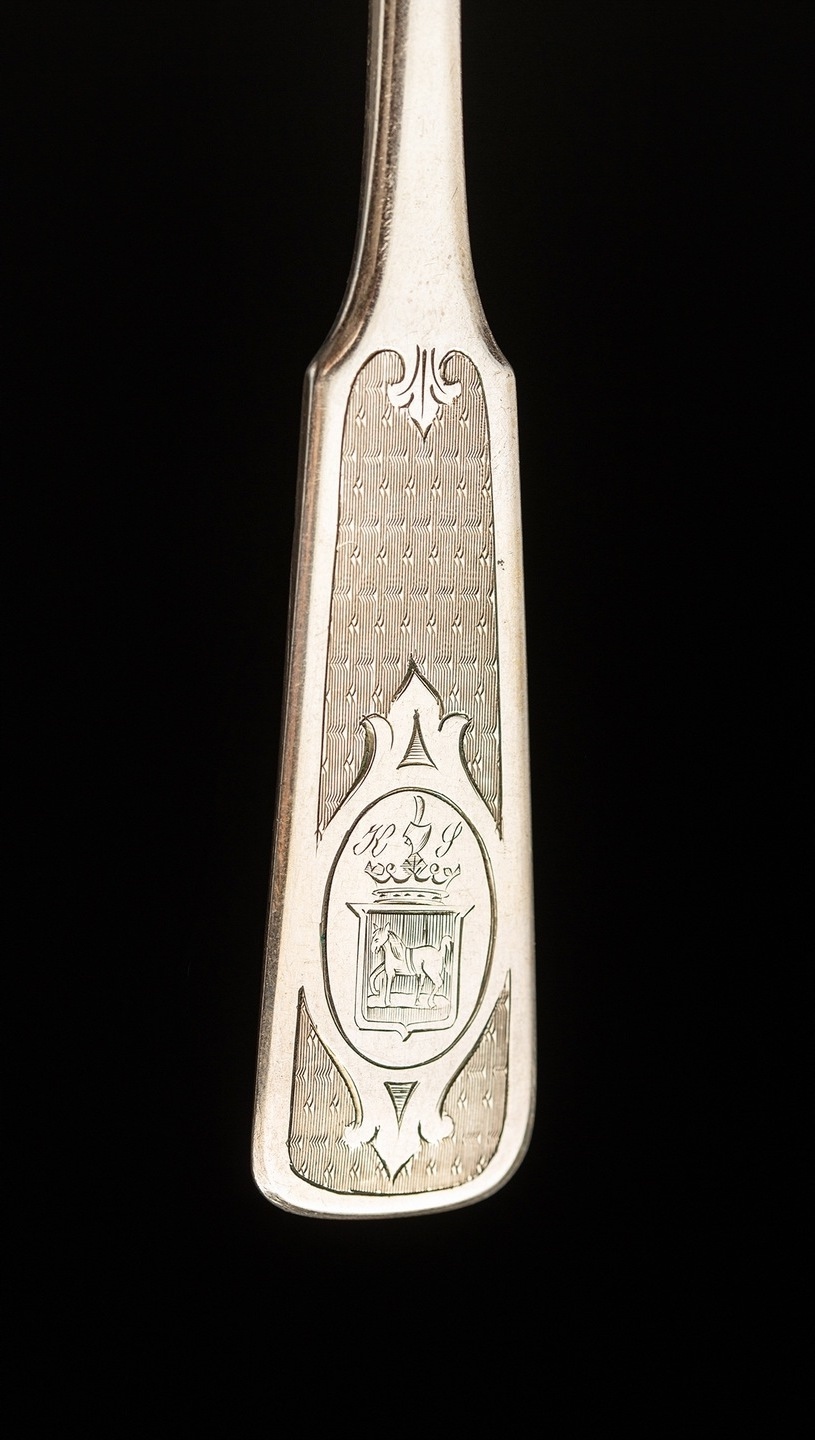 h1 h1>Уникальный набор серебряных столовых приборов, изготовленный в мастерской варшавского ювелира Людвика Наста. В набор входят четыре десертные ложки, четыре столовые ложки и четыре вилки. Все элементы сервиза завершаются лопаточными ручками, с изящно выгравированным гербом Стариконь.