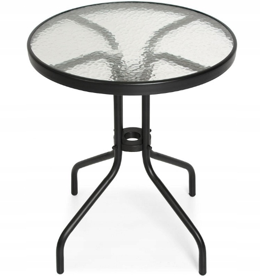 Он имеет пластину из закаленного стекла диаметром 60 см. Столешница изготовлена из закаленного стекла толщиной 5 мм. Стекло прозрачное, имеет неровный орнамент. Стол стоит на четырех устойчивых ножках и выдерживает нагрузку до 10 кг