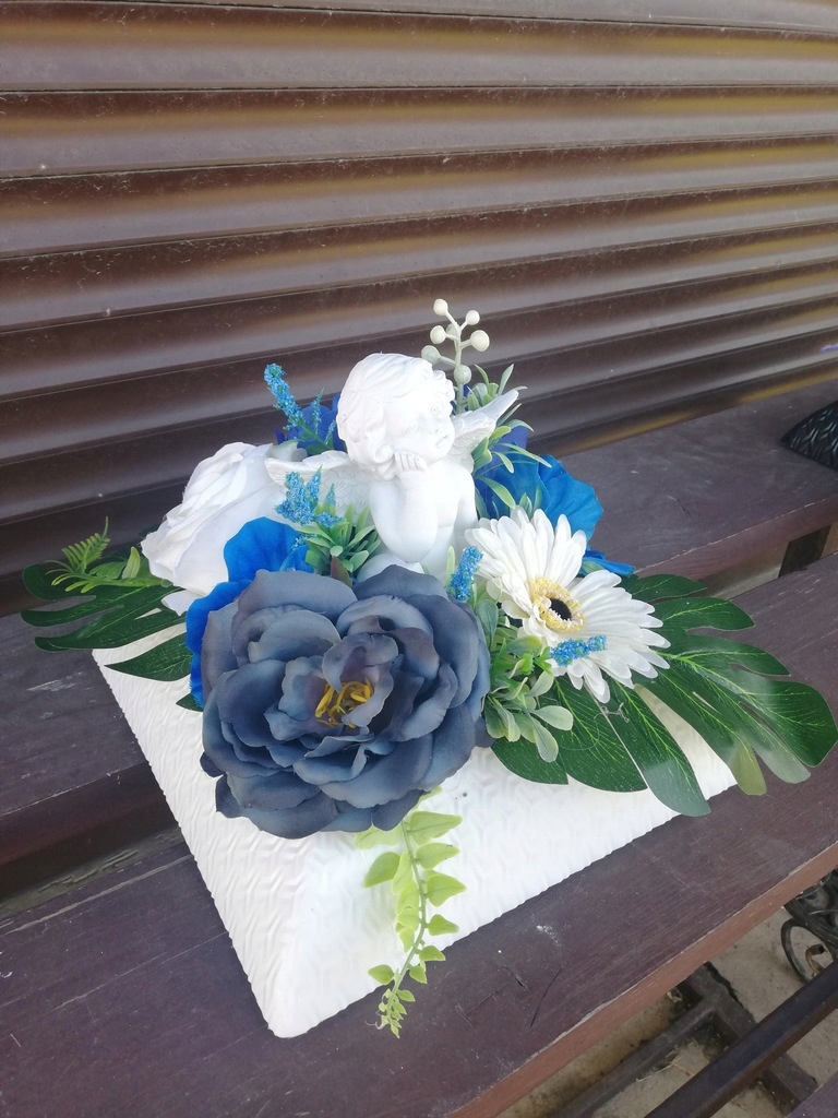 Цветочная композиция была тщательно изготовлена, с соблюдением модных цветов, из материалов очень хорошего качества и искусственных цветов в белом пластиковом корпусе, утяжеленных.