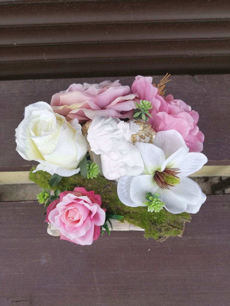 Цветочная композиция была тщательно изготовлена, с соблюдением модных цветов, из материалов очень хорошего качества и искусственных цветов в белом пластиковом корпусе, утяжеленных.