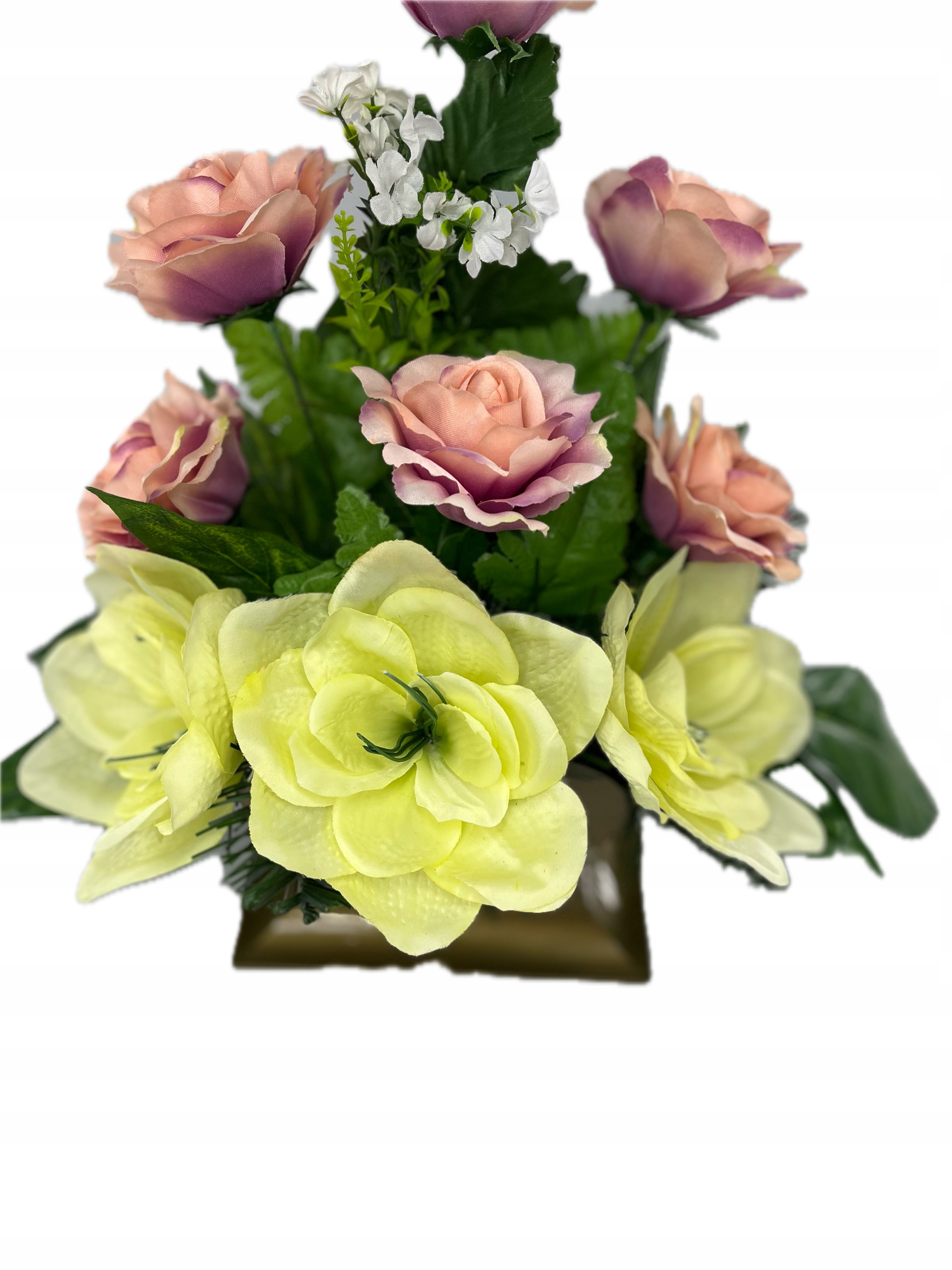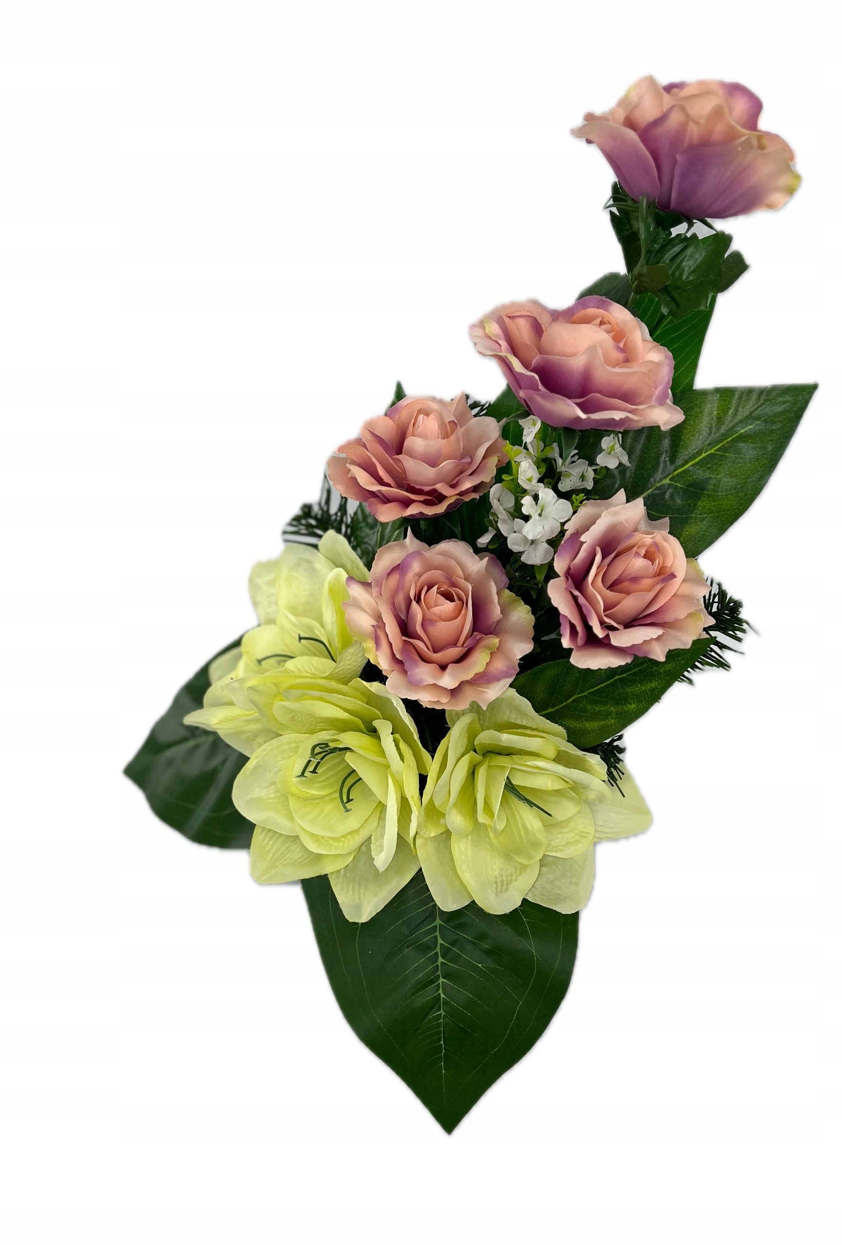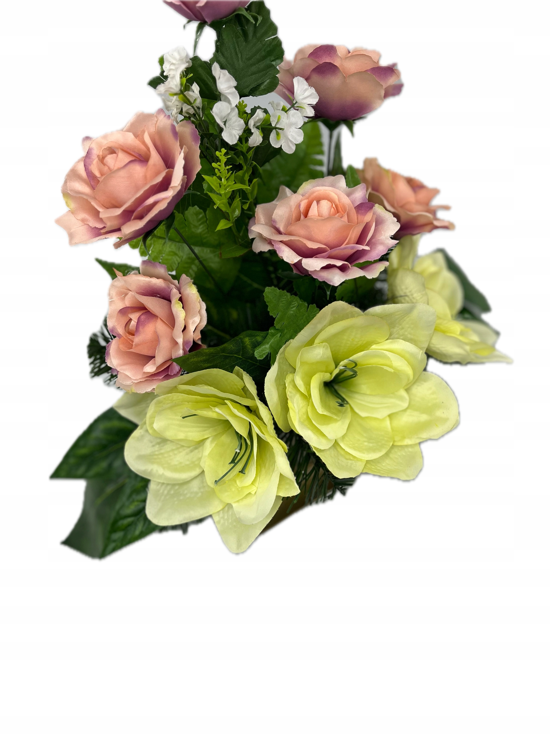- изготовлен из искусственных цветов в розовых зеленых с помощью богатой зеленой растительности. Не менее красивые продукты. Устойчивый к ветру или морозу. Правильно защищен для доставки. Букет: