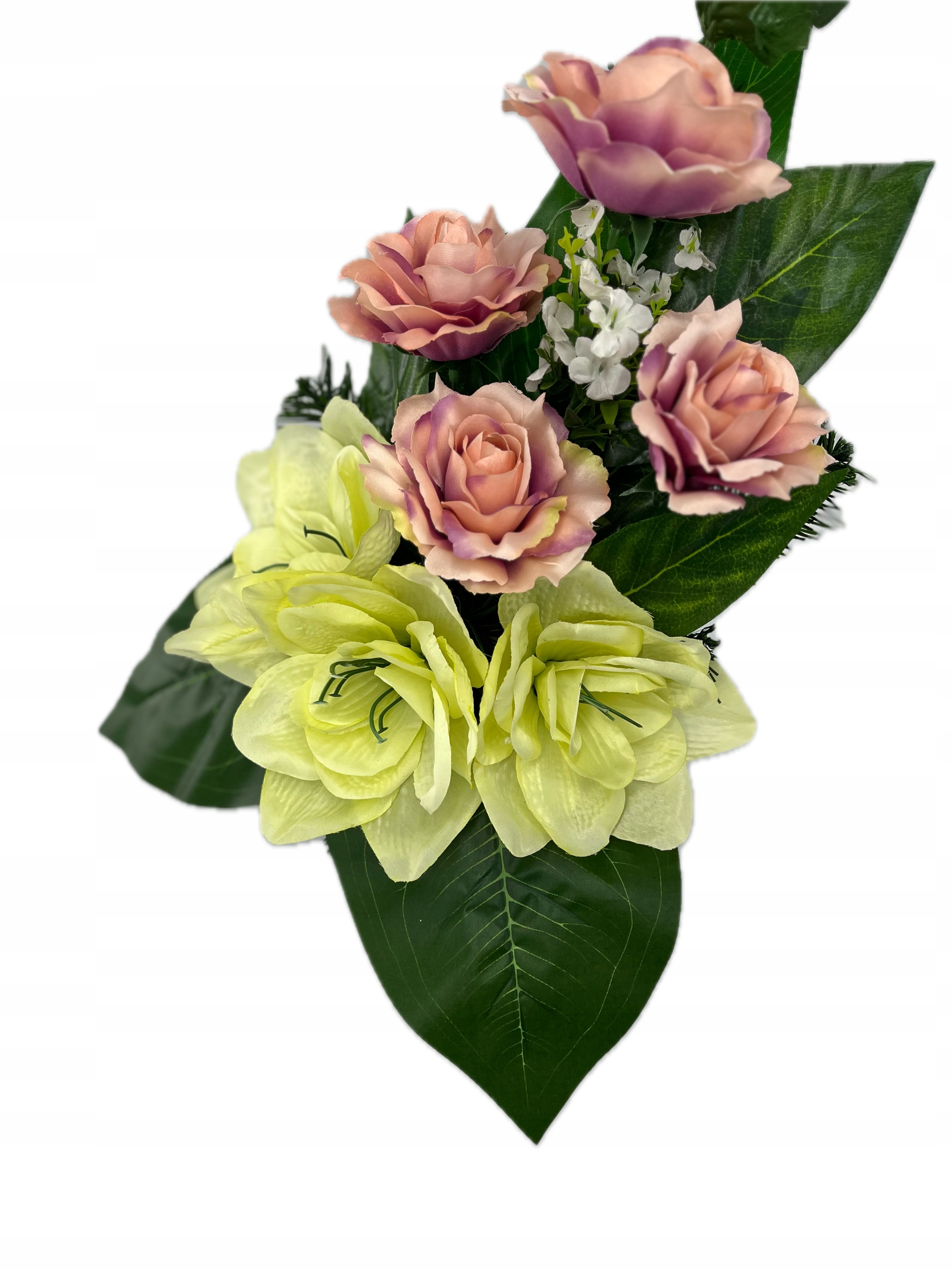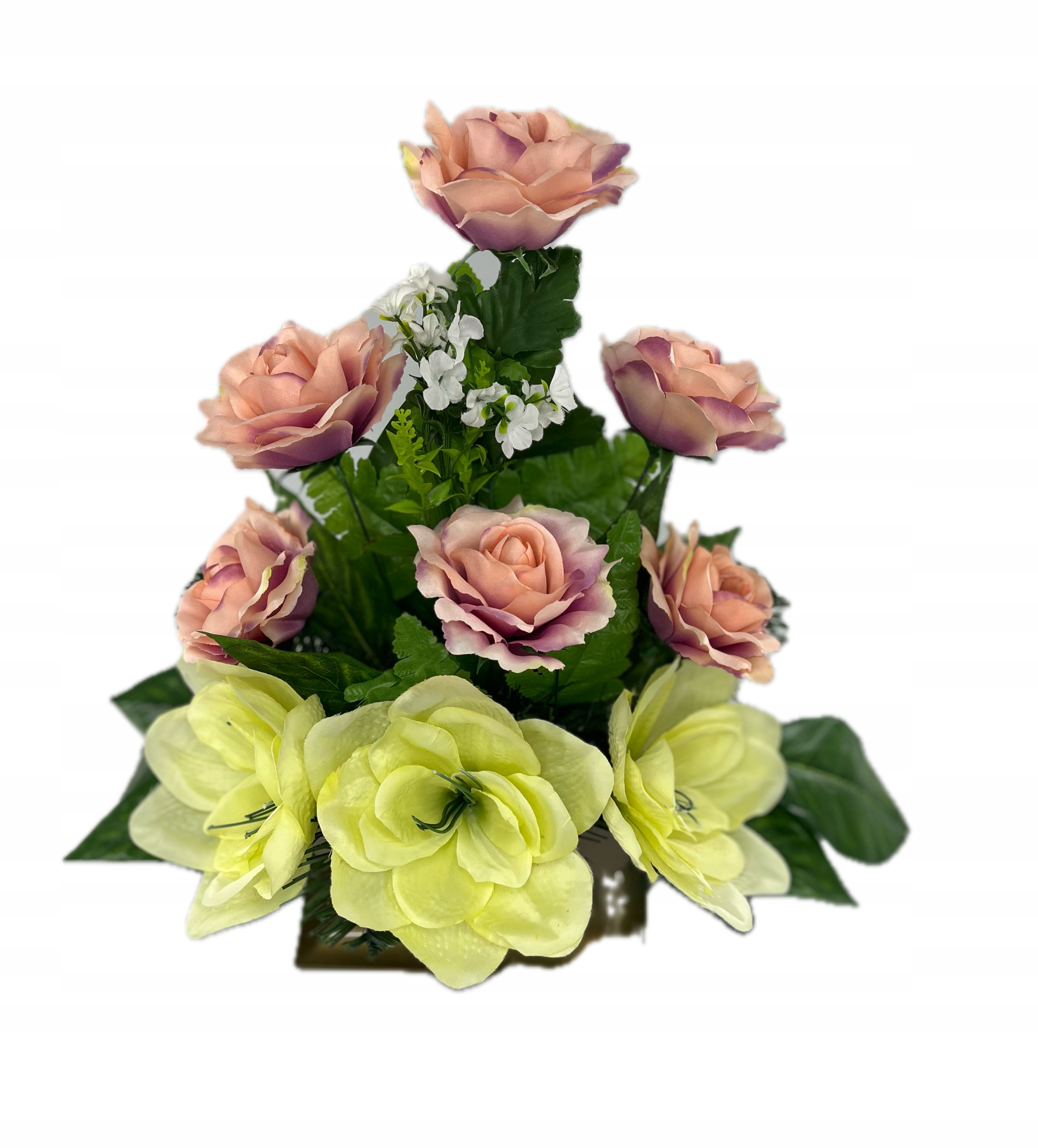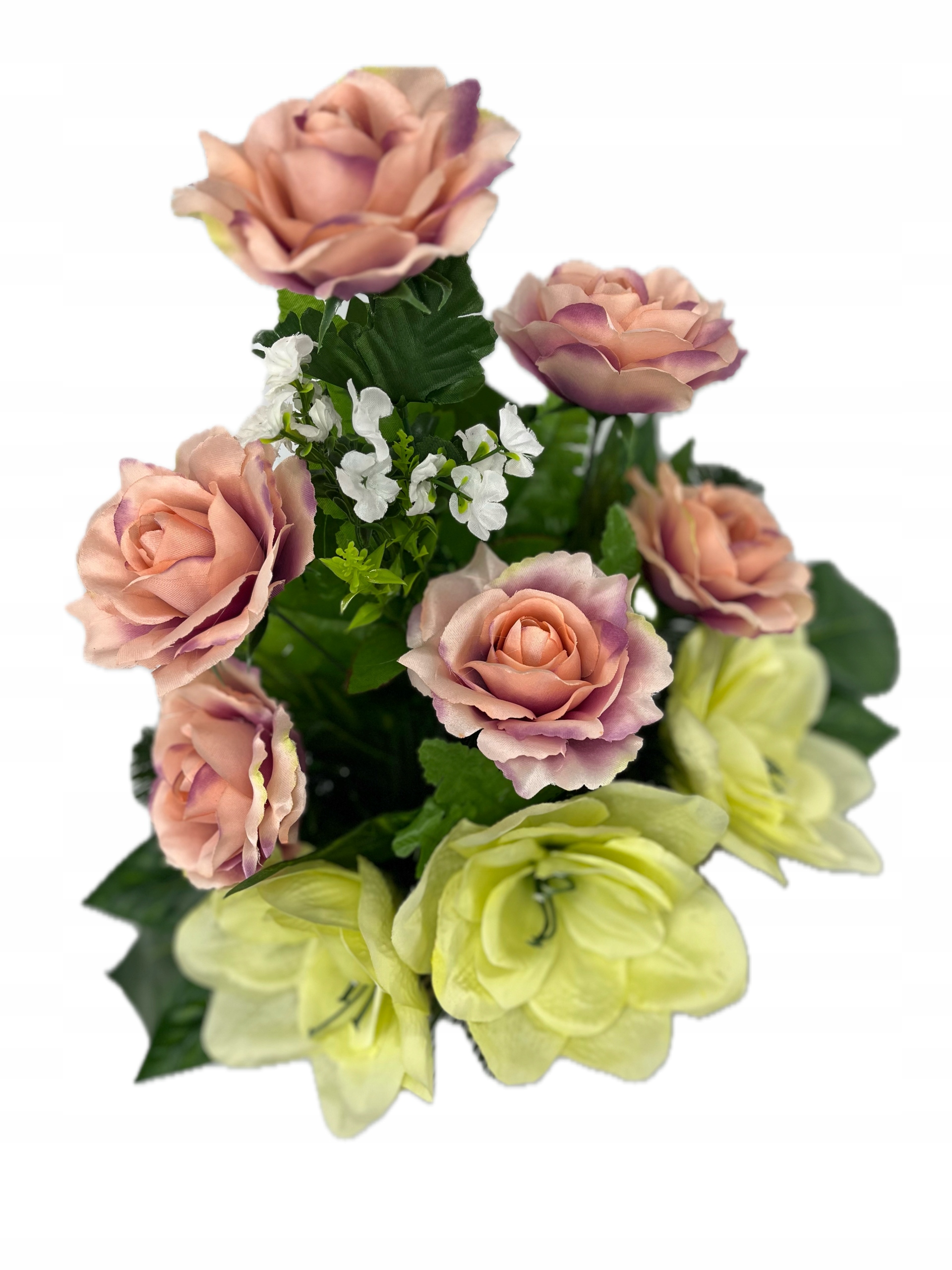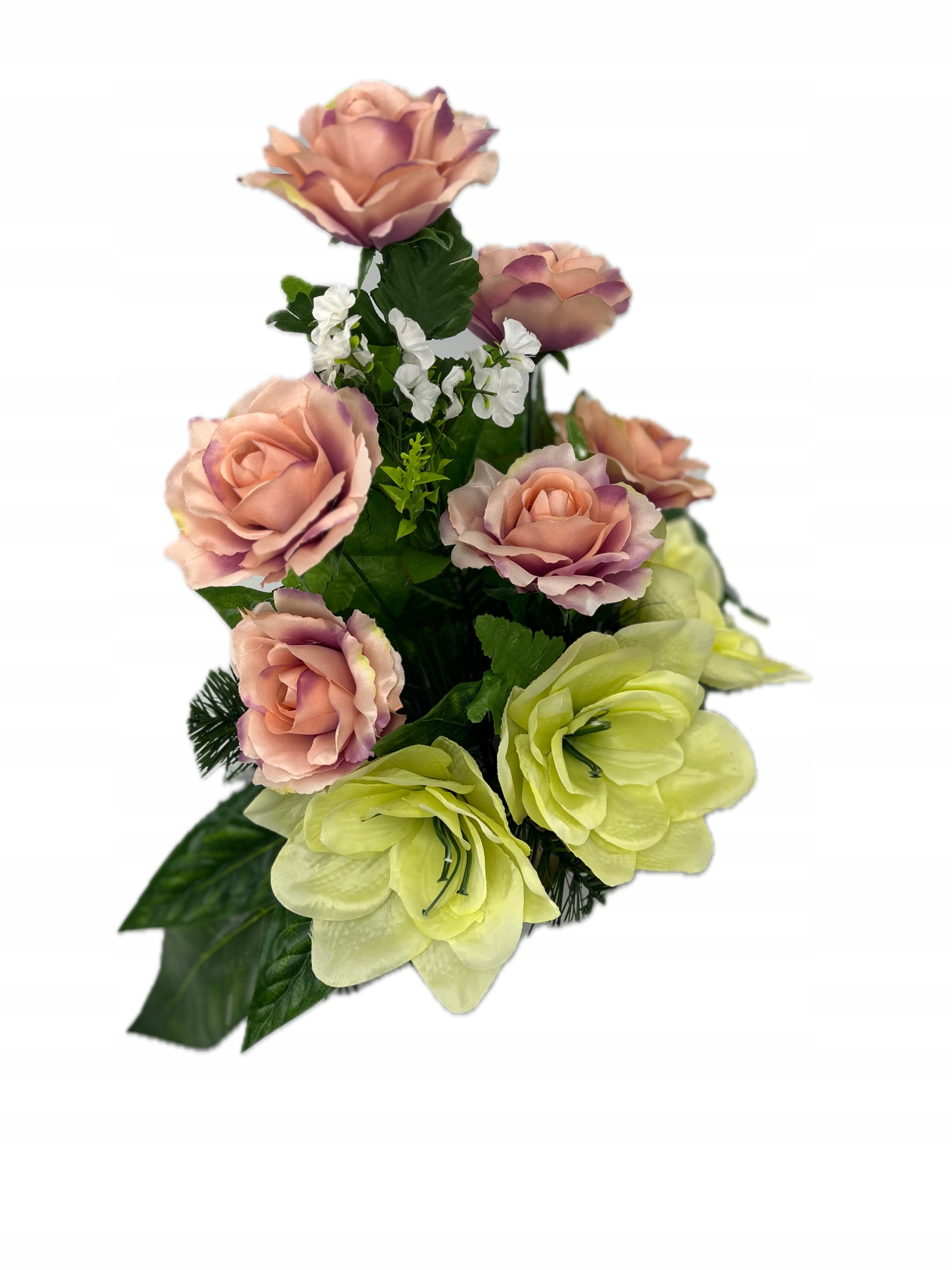 - изготовлен из искусственных цветов в розовых зеленых с помощью богатой зеленой растительности. Не менее красивые продукты. Устойчивый к ветру или морозу. Правильно защищен для доставки. Букет: