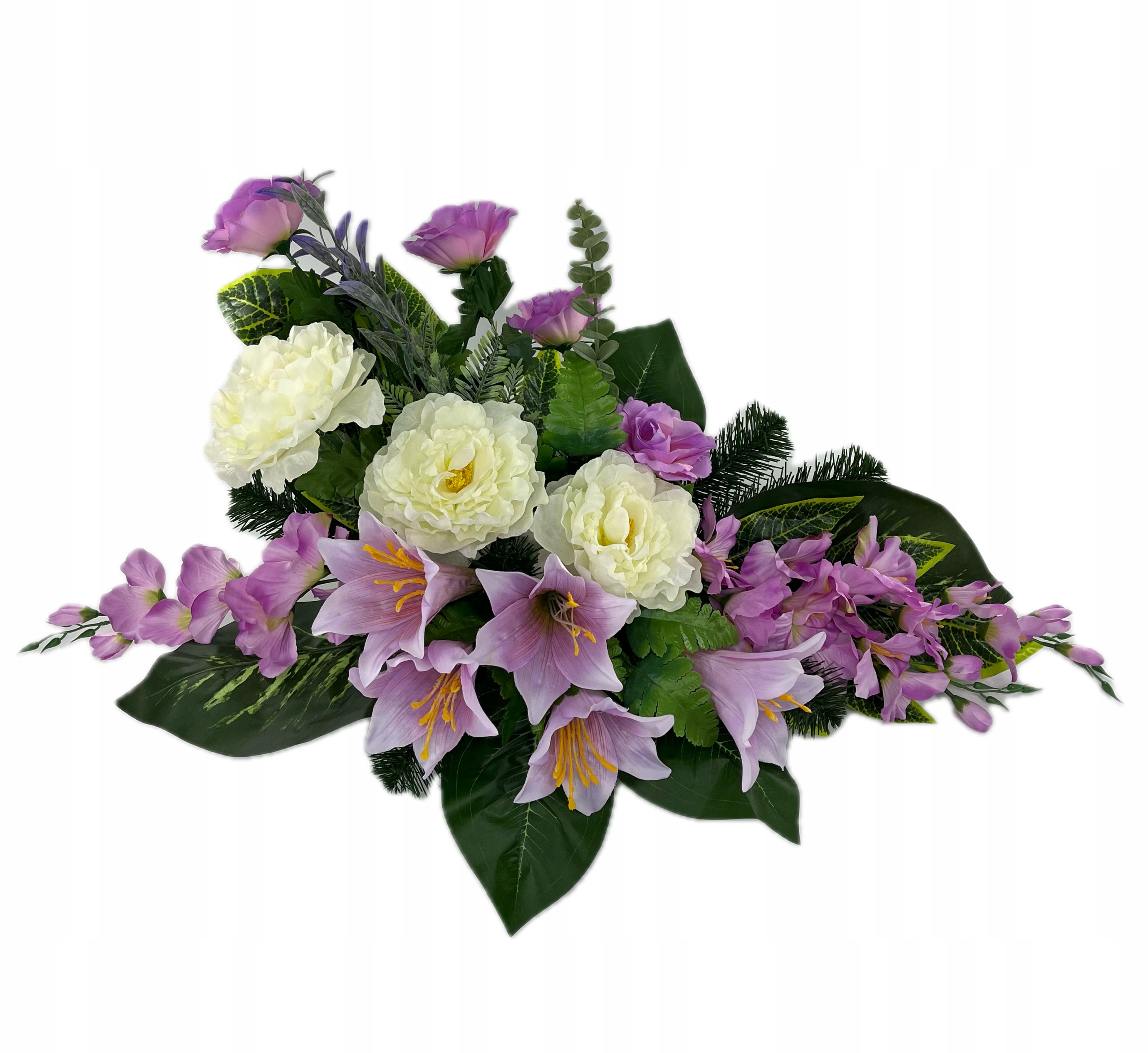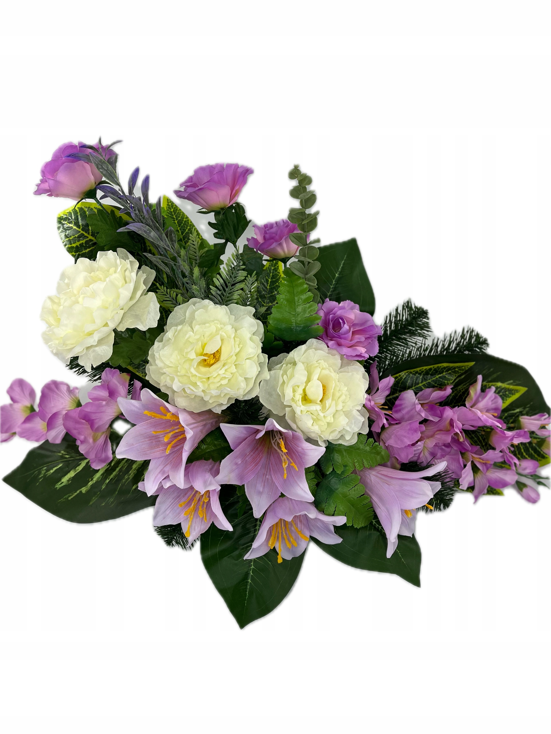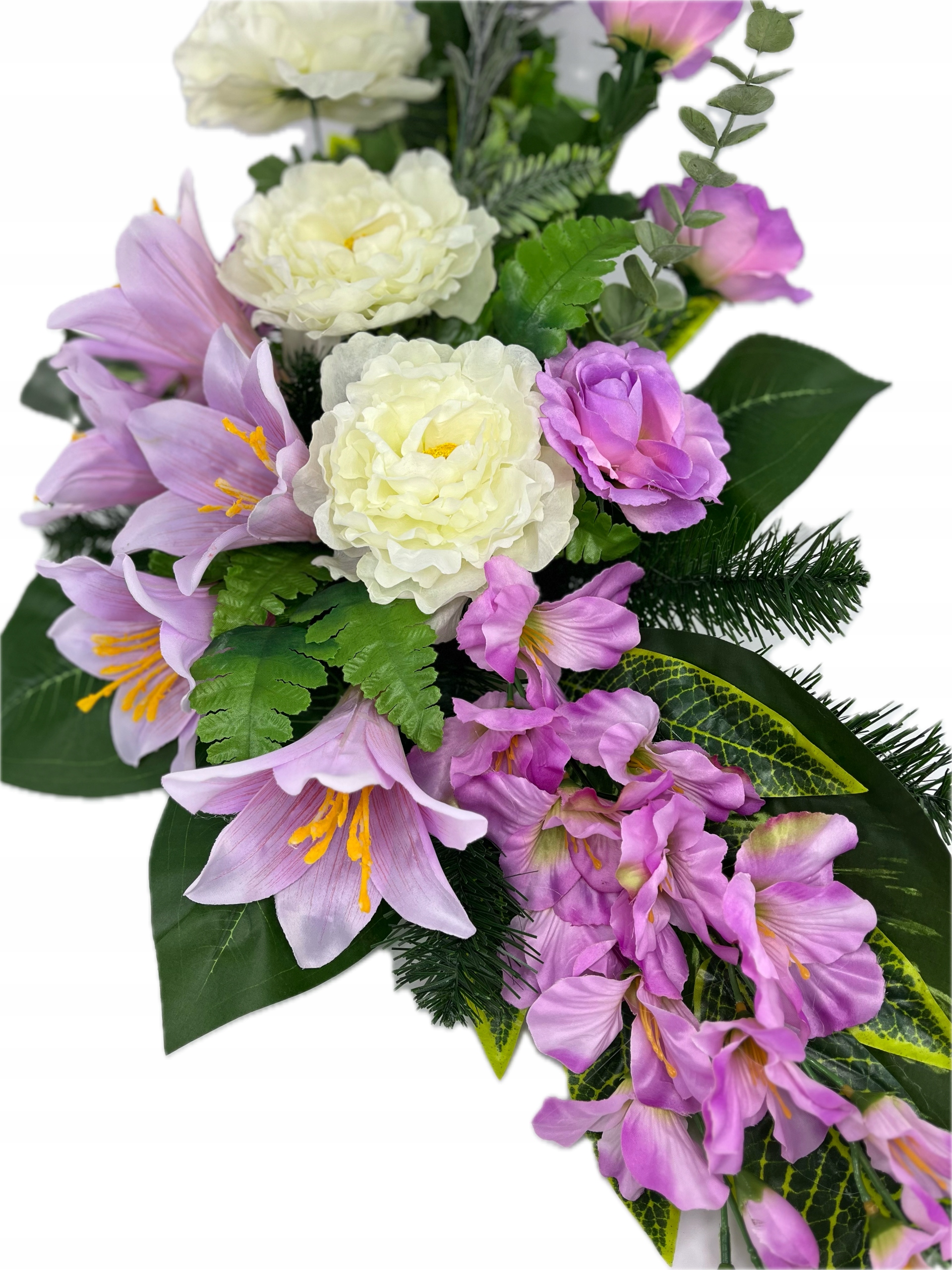 - сделано из искусственных кремовых фиолетовых цветов с богатой зеленой растительностью. Продукты. Frost