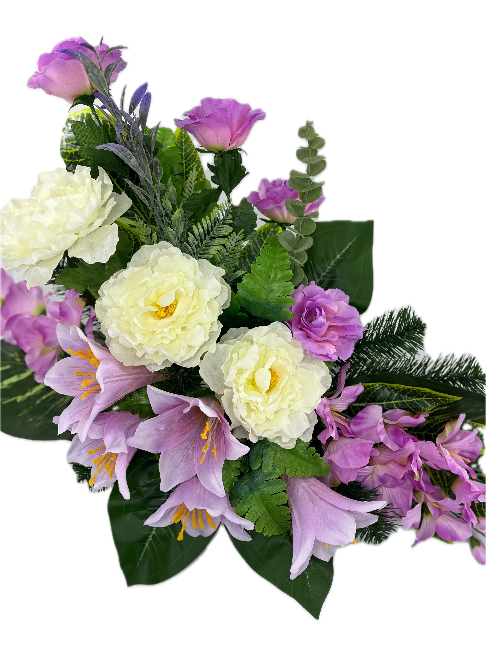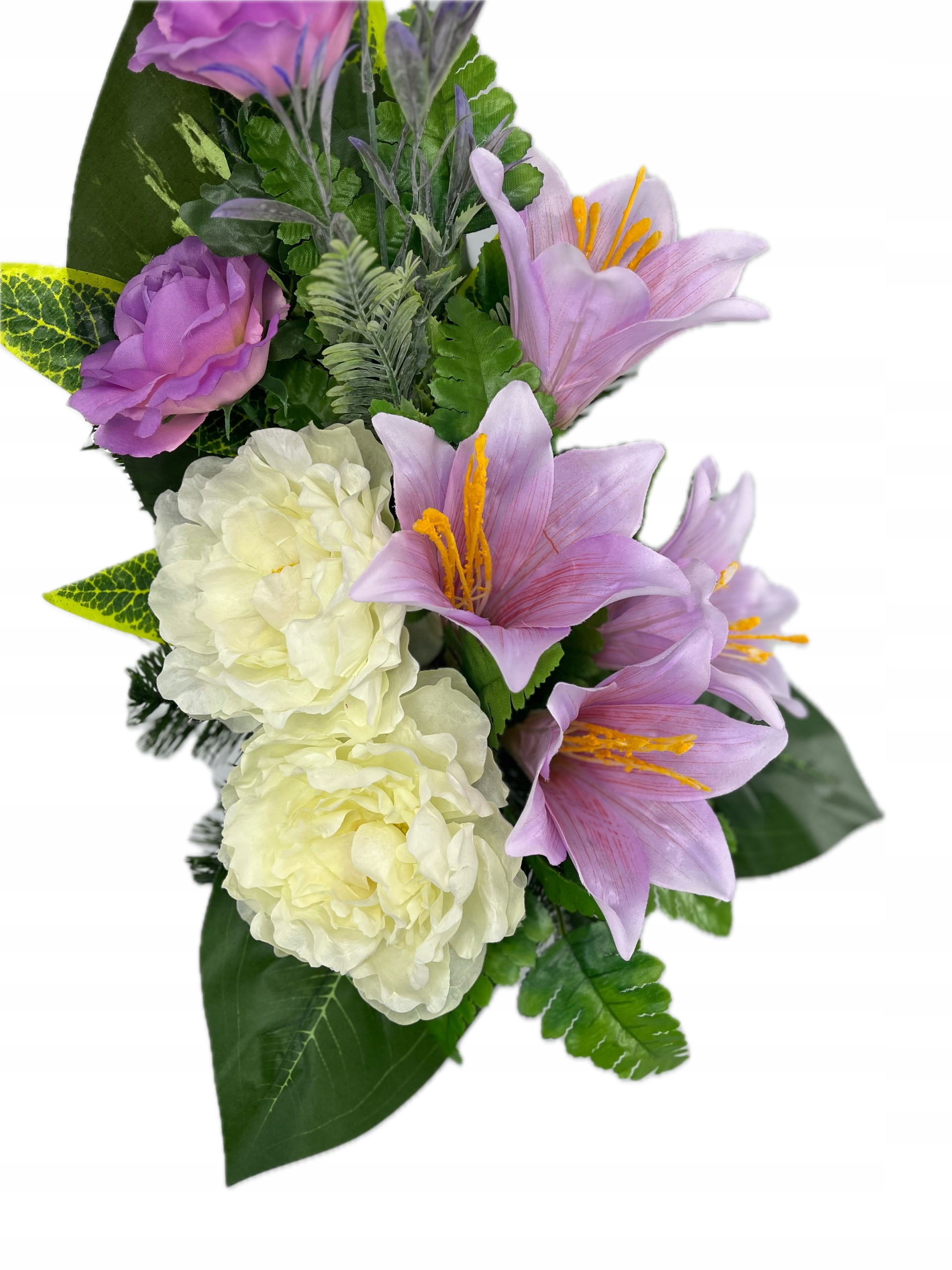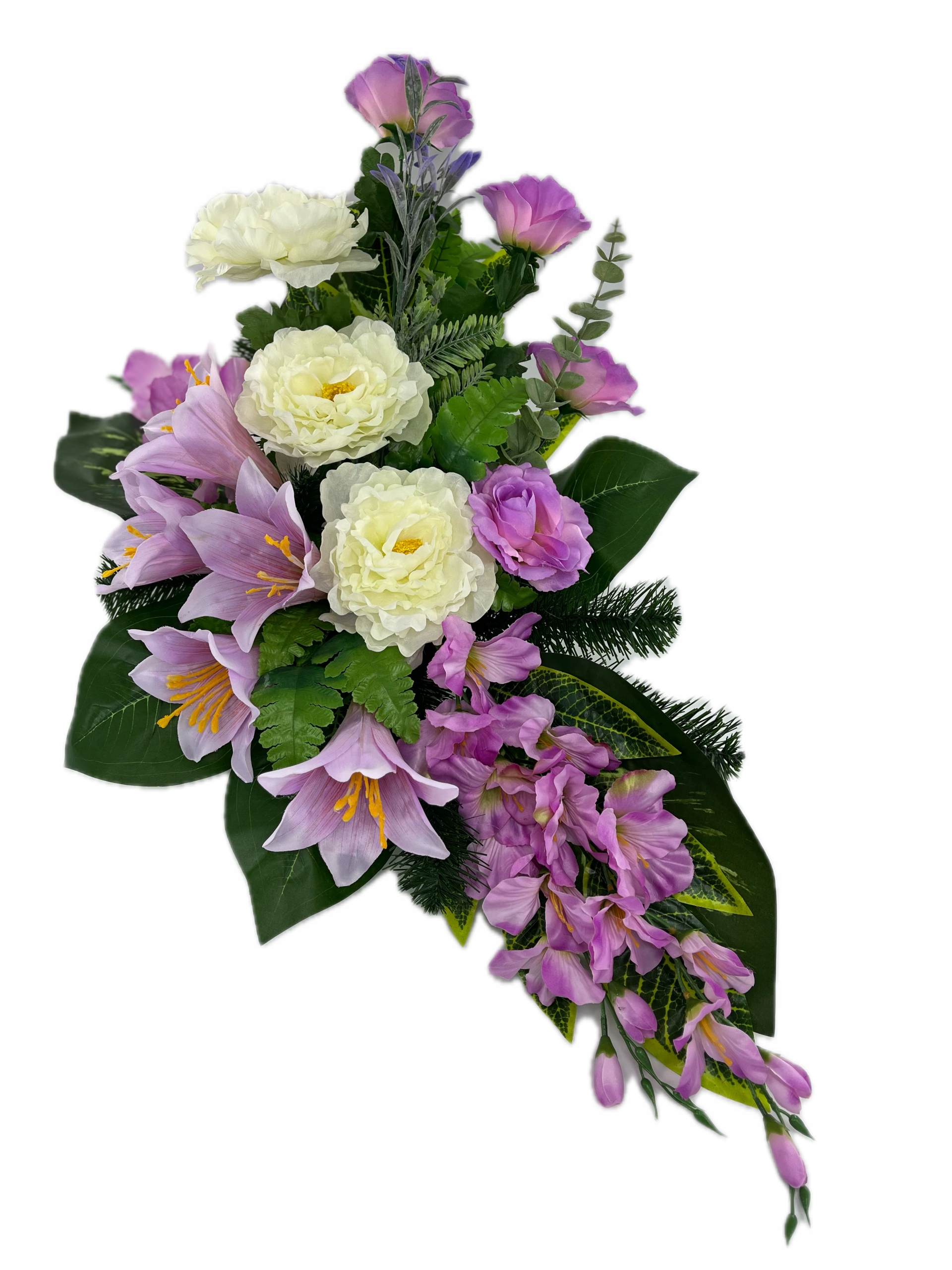 - сделано из искусственных кремовых фиолетовых цветов с богатой зеленой растительностью. Продукты. Frost