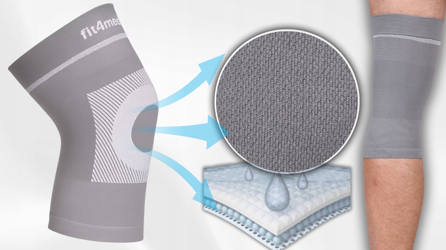 - Анатомическая форма и стимуляция рецепторов - обеспечивает идеальное прилегание к колену, одновременно стимулируя кожные рецепторы, что поддерживает стабильность суставов и микроциркуляцию.