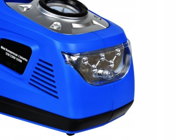Мини-компрессор со светодиодным фонариком мощностью 100 Вт от GEKO, питание от сети 230 В/12 В. Устройство прекрасно подходит для накачивания колес автомобиля и велосипеда, а благодаря насадкам, входящим в комплект, можно надувать матрасы, игрушки, мячи и т. д. Кроме того, устройство имеет светодиодный фонарик (5 диодов), что позволяет без проблем использовать компрессор в ночное время.