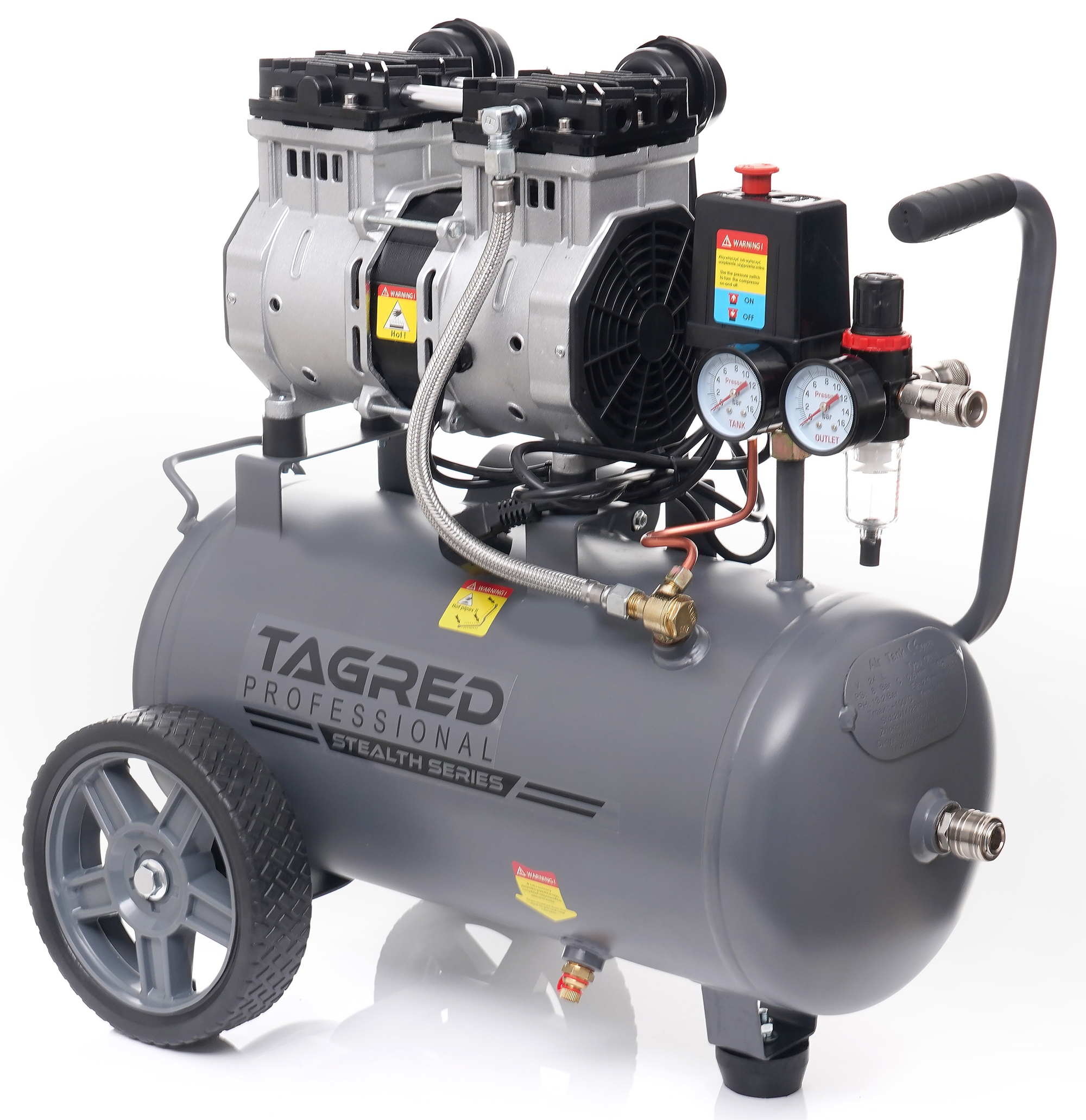 Высокая культура труда, безопасность и комфорт – удобство и простота использования – это лишь некоторые преимущества новейшей линейки безмасляных компрессоров TAGRED STEALTH SERIES! Безмасляные компрессоры TAGRED необходимы там, где сжатый воздух не может быть загрязнен маслом, например, в стоматологических, пищевых и фармацевтических устройствах, а также в быту. Наши компрессоры работают намного тише, меньше и легче, а значит, более мобильны, чем традиционные масляные компрессоры.