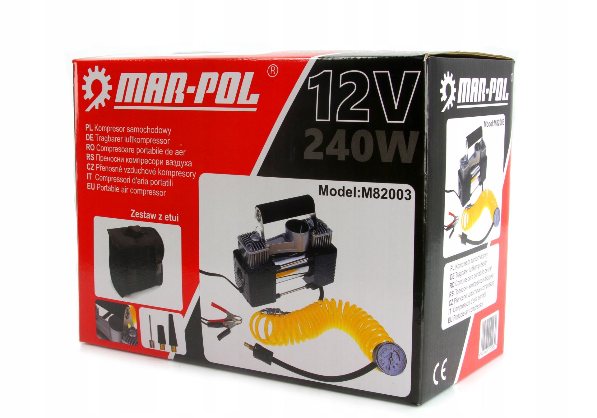 Эффективный двухпоршневой компрессор 12 В — полезное устройство во многих ситуациях. Компрессор питается от сети 12В и может питаться напрямую от аккумулятора благодаря входящему в комплект кабелю, оснащенному зажимами. Изготовлен из металла, имеет удобную ручку для переноски и резиновые ножки, обеспечивающие устойчивость во время работы. Также имеется переключатель включения/выключения и небольшой отсек для других насадок. В комплект входит удлинительный напорный шланг со встроенным манометром, 3 насадки для надувания, например, мячей и сумка на молнии.