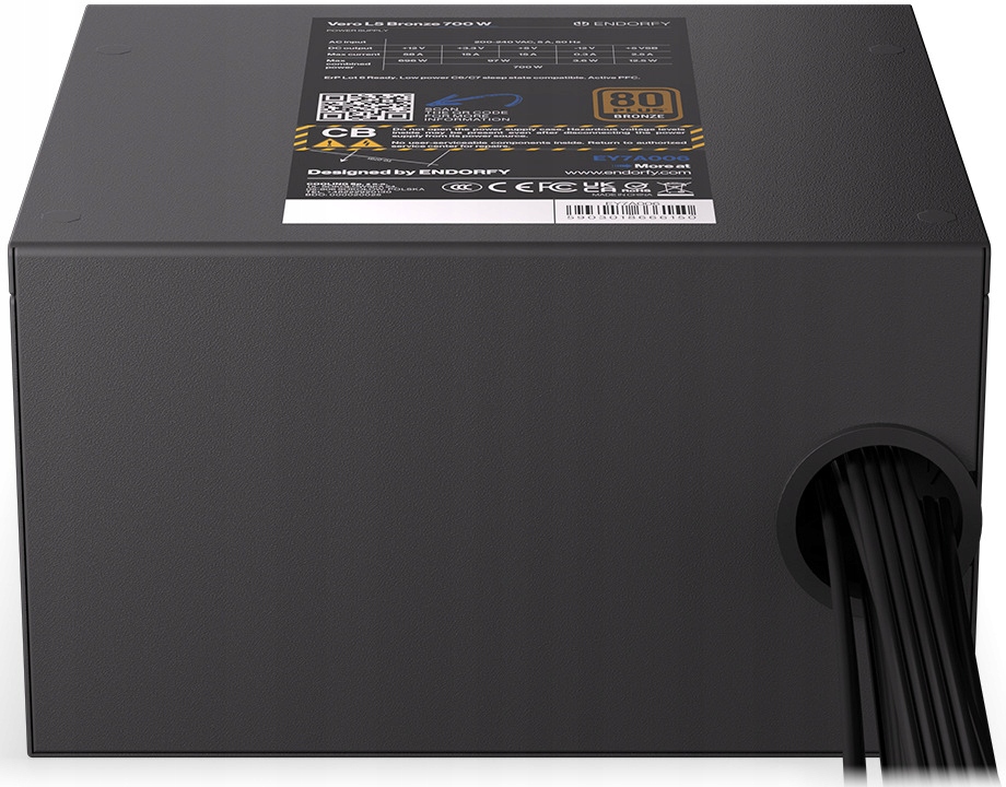 ENDORFY Vero L5 Bronze 700 Вт — стабильный источник питания с преобразователями постоянного тока для регулирования напряжения и обеспечения постоянной мощности мощностью 700 Вт. Внутри установлены тайваньские электролитические конденсаторы. и алюминиево-полимерный Чайо. Все это дает сертификат ENDORFY Vero L5 Bronze 700 W 80 PLUS® Bronze.