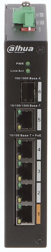 Dahua PFS-3106-4ET-60 — неуправляемый промышленный PoE-коммутатор с бюджетом мощности 60 Вт, имеющий 4 порта PoE 10/100 Мбит/с, 1 порт Uplink 10/100/1000 Мбит/с и 1 слот SFP. Особенно рекомендуется для построения систем мониторинга в сложных климатических условиях.