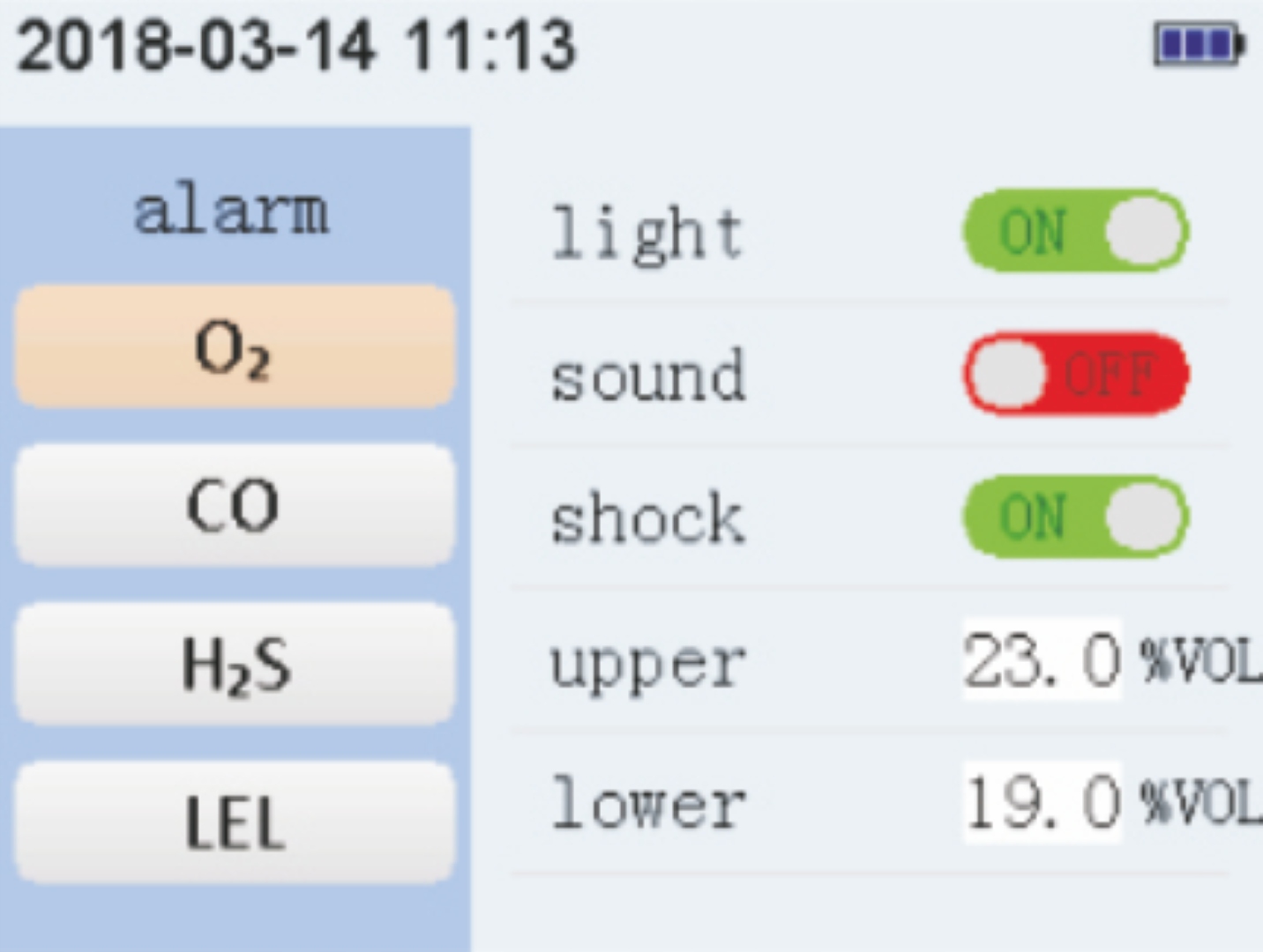 Для каждого газа можно установить параметры сигнализации отдельно.