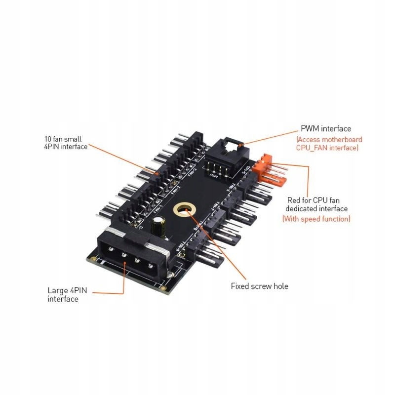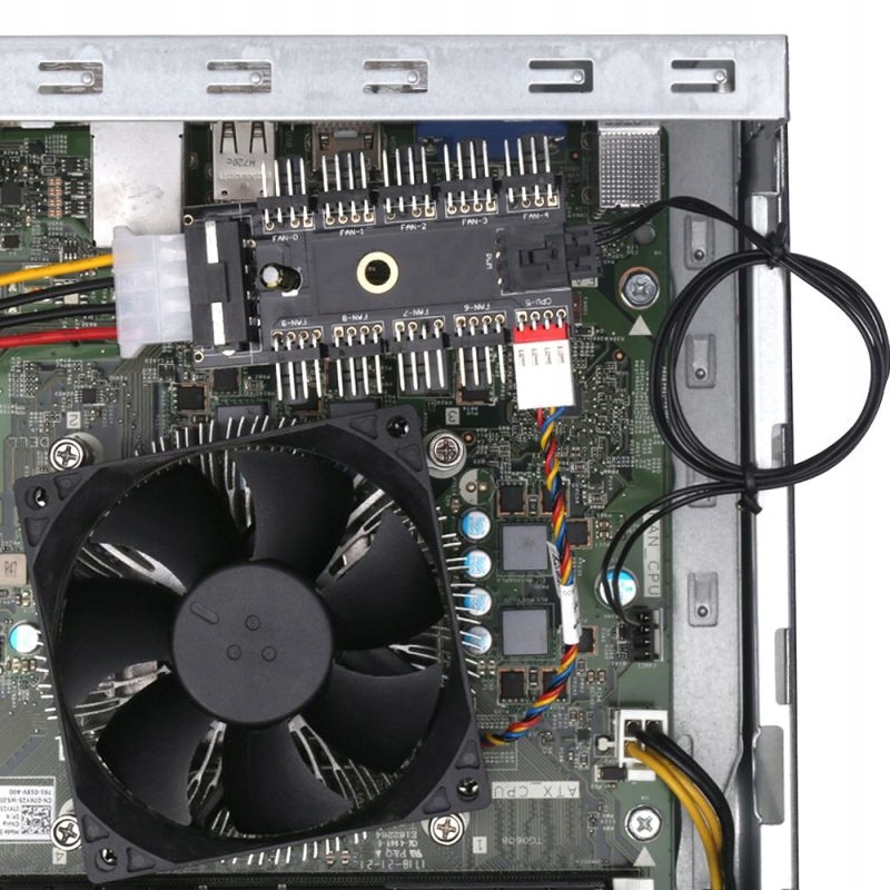 Распределитель, позволяющий подключить до 10 вентиляторов. Он имеет 10 4-контактных разъемов и питание от порта MOLEX. Красный разъем используется для подключения вентилятора процессора. На задней стороне адаптера имеется клейкая лента 3М, которая легко и надежно приклеит пластину к корпусу компьютера.