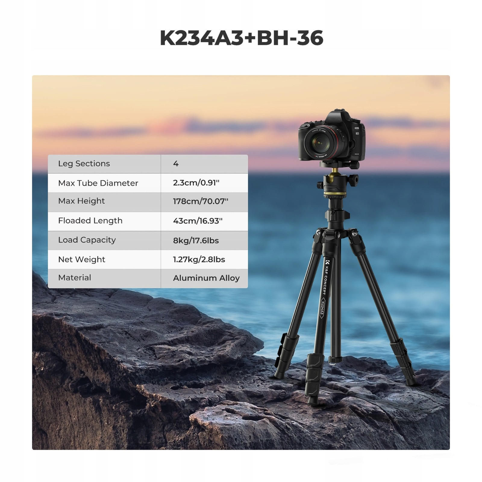 K & F Concept K234A3 Штатив с шаровой головкой BH-36-это идеальное сочетание мобильности и функциональности. Взвешивая только 1,27 кг, он очень ультразвук, благодаря которой это не будет значительной нагрузкой даже во время долгого блуждания или поездок. После складывания это всего лишь 43 см, что позволяет легко вписать его в чемодан или прикрепить его к рюкзаку. Набор также включает в себя удобную сумку, которая облегчает транспортировку, что делает штатив K & F Concept K234A3 лучшим выбором для путешествующих фотографов и Vloggers