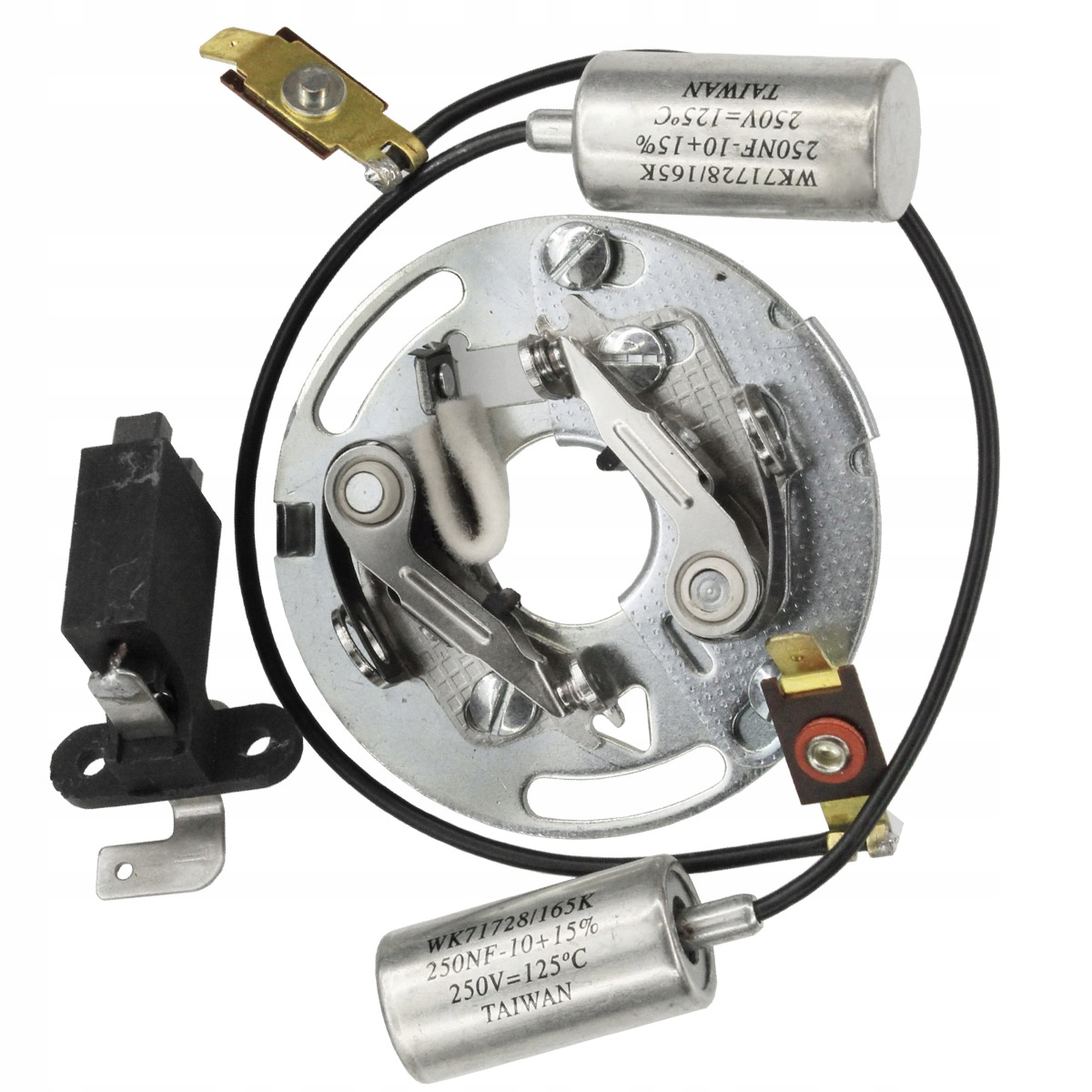 В комплект входят: Плита зажигания, 2 платиновые клеммы, 2 конденсатора + щеткодержатель.
