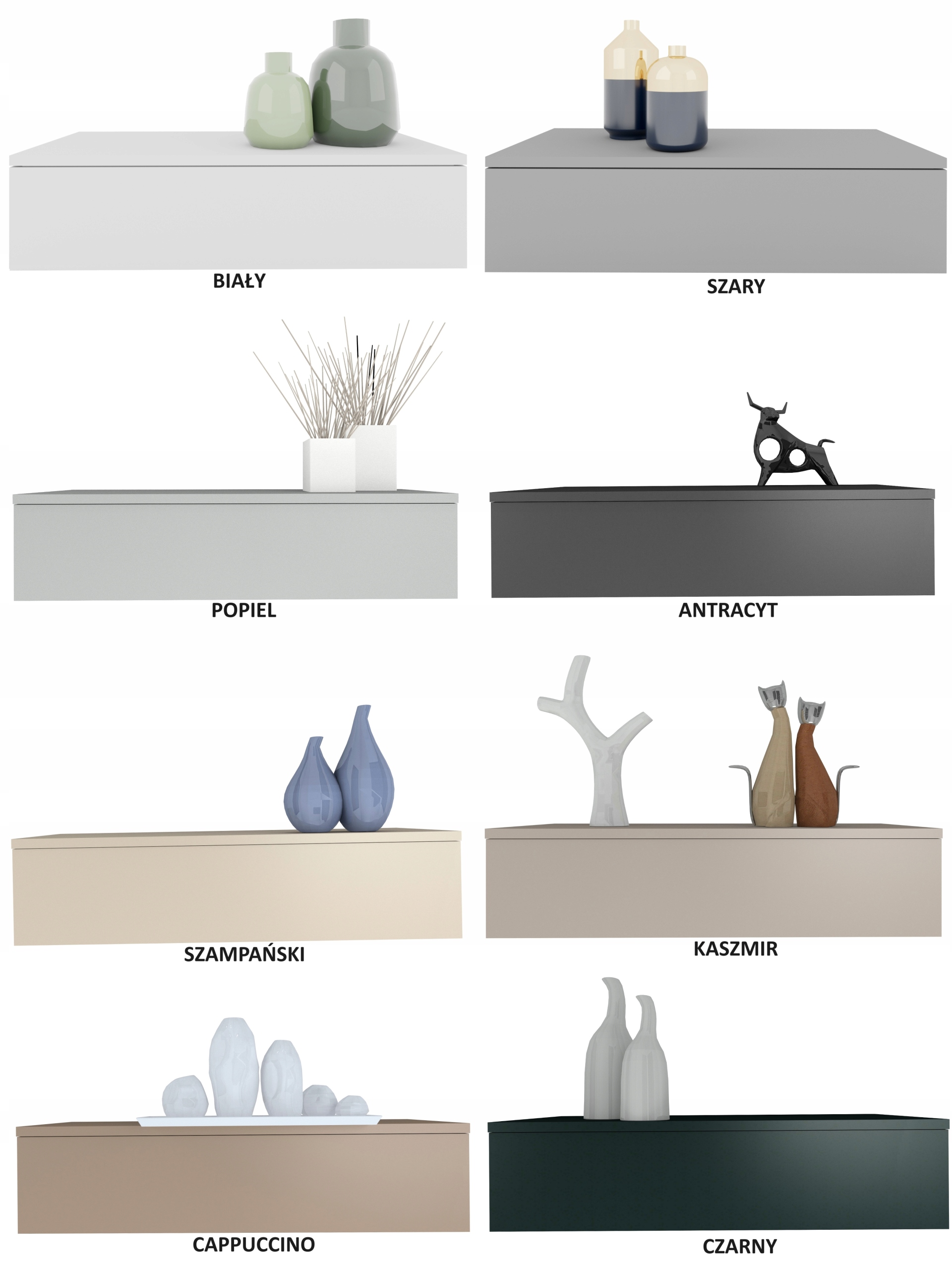 Шкаф изготовлен из прочного ламината толщиной 18 мм. Эта доска отличается долговечностью и прочностью. Шкаф изготовлен из более толстой доски, что делает шкаф болеедолговечным и устойчивым. Матовое покрытие облегчает уход за мебелью. Шкаф покрыт ПВХ толщиной 0,8. Ящики оснащены направляющими известной на столярном рынке компании Шарикоподшипники GTV полного выдвижения, пользующейся хорошей репутацией. Ящик открывается до самого конца, что облегчает доступ к спрятанным в ящике вещам. Сзади установлены металлические угловые кронштейны, которые видны только при выдвинутом ящике, поэтому он идеально прилегает к стене.