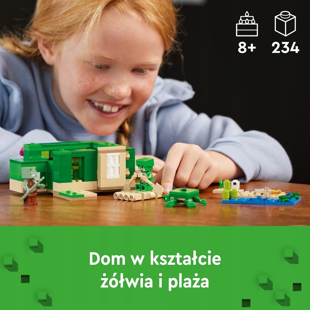 Игроки строят дом в форме черепахи прямо из Minecraft с окнами, фонарями, дверью, кроватью, столом, верстаком и плитой. Подъемная крыша обеспечивает легкий доступ внутрь. Снаружи есть пляж с сахарным тростником, черепашьими яйцами и бамбуковым плотом с веслами. Также есть знаменитые фигурки и мобы Minecraft: воин в черепашьей шкуре и шлеме, утопленник с трезубцем, черепаха, питающаяся водорослями, и три маленькие черепахи. Аксессуары также включают карту и телескоп. Любители активного отдыха, творческого конструирования и ухода за животными будут в восторге от этой универсальной игрушки. Для дополнительного цифрового развлечения приложение LEGO Builder позволяет строителям масштабировать и вращать модели в 3D и отслеживать их прогресс.