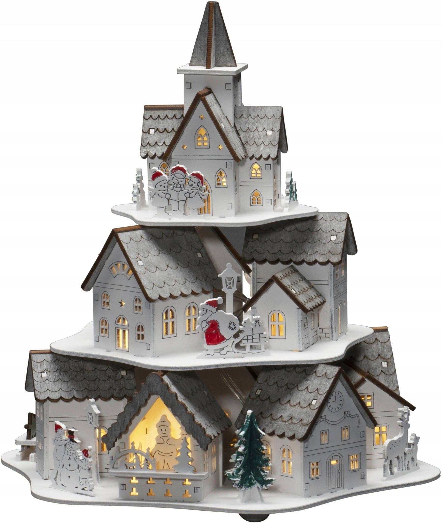 Элегантный освещенный вертеп известного шведского бренда Konstsmide в виде единого трехуровневого «дома», внутри которого можно увидеть домики и фигурки меньшего размера.