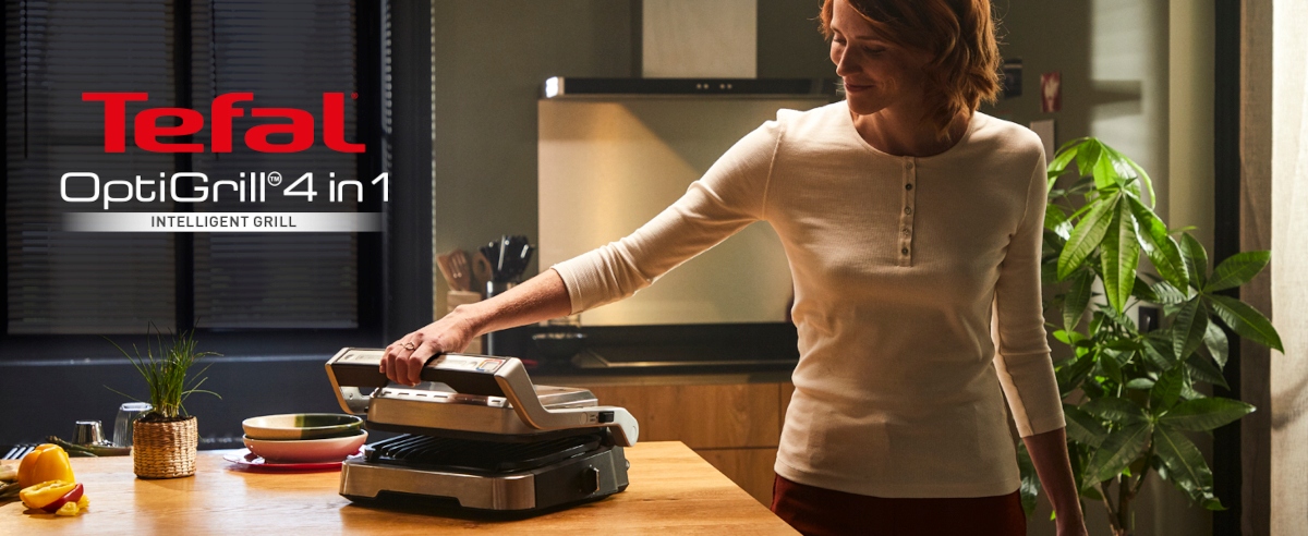Новый интеллектуальный гриль OptiGrilla — 4 функции в 1! Вы можете обжаривать ингредиенты с обеих сторон или открыть устройство и жарить на вдвое большей поверхности, готовить все блюдо сразу или запекать, как в духовке.