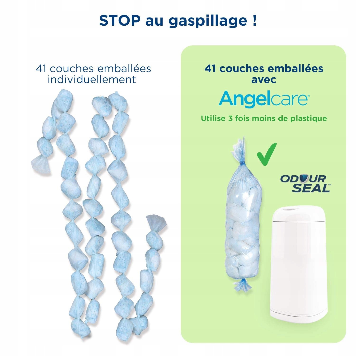 Для контейнера предназначены специальные вкладыши Angelcare — каждый вкладыш вмещает примерно 100-150 использованных подгузников (в зависимости от размера подгузников). Вставки изготовлены из многослойной фольги Odor Seal, обеспечивающей непроницаемость для запахов и бактерий. Картриджи чрезвычайно легко заменить: к каждому из них прилагается графическая инструкция по замене. В комплект к контейнеру входит 1 стартовая вставка.