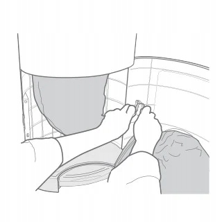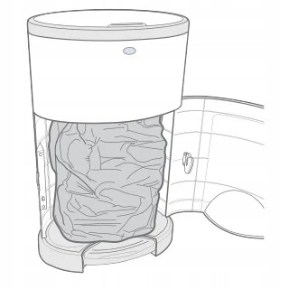 Замена вставки в контейнер Korbell очень проста. Вставка представляет собой рукав, свернувшийся особым образом. Сумка наносится на пластиковый обод, встроенный в контейнер. Первый слой потянут и связывает узел